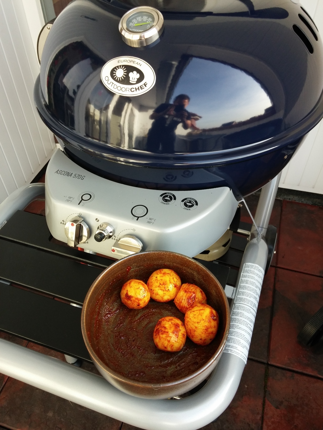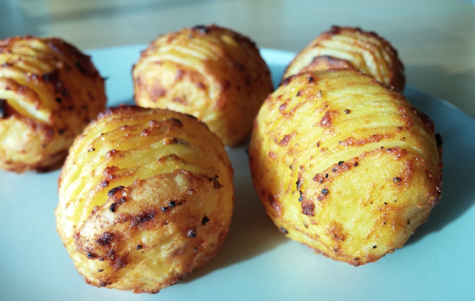 Also, fix ein paar Kartoffeln geschält und auf der Oberseite im Abstand von 1 bis 2 mm zur Hälfte eingeritzt. Kurz in Olivenöl wenden und mit Salz, MD und etwas Pfeffer von der 9-Pfeffer-Symphonie würzen. Spontan fiel mir dann noch ein, dass ich seit unserem letzten Hamburg-Trip auch noch etwas Smoked Pepper besitze, was noch originalverpackt im Gewürzschränkchen lag. Ich konnte der Versuchung nicht widerstehen und habe auch noch etwas vom Räucher-Paprika-Aroma dazugegeben. Auf den vorgeheizten Grill mit den Fächerkartoffeln und indirekt für ca. 30 Minuten bei max. 160 Grad grillen und dann – einfach genießen!
