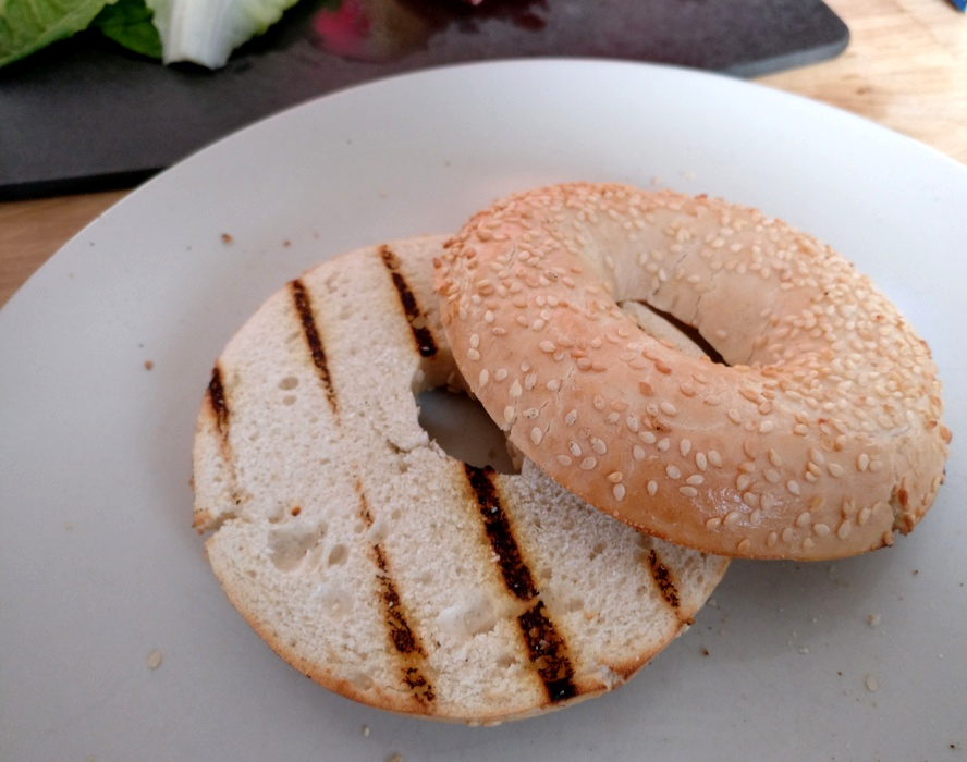 Von Zeit zu Zeit rühre ich die Möhren-Zwiebel-Mischung durch, bis sie nach schließlich 15 – 20 Minuten fertig ist. Fünf Minuten vor Grillende kommen auch die Bagel auf den Grillrost, die ich zunächst auf meinem Warmhalterost langsam erwärme, bevor sie dann für 30 Sekunden direkt auf dem Grillrost angeröstet werden.