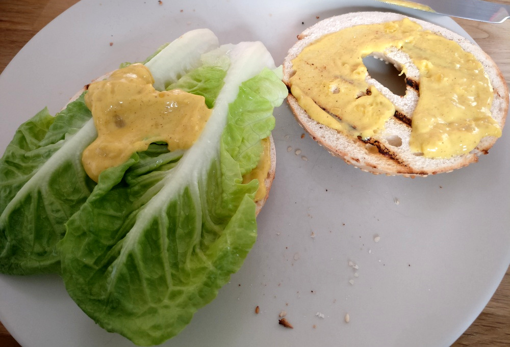 Der Möhren-Curry-Bagel kann nun angerichtet werden. Dazu bestreiche ich die Bagel-Hälften mit Currysauce und belege die Unterseite mit grünem Salat, den Möhren und Zwiebeln. Zusammenklappen, und fertig!