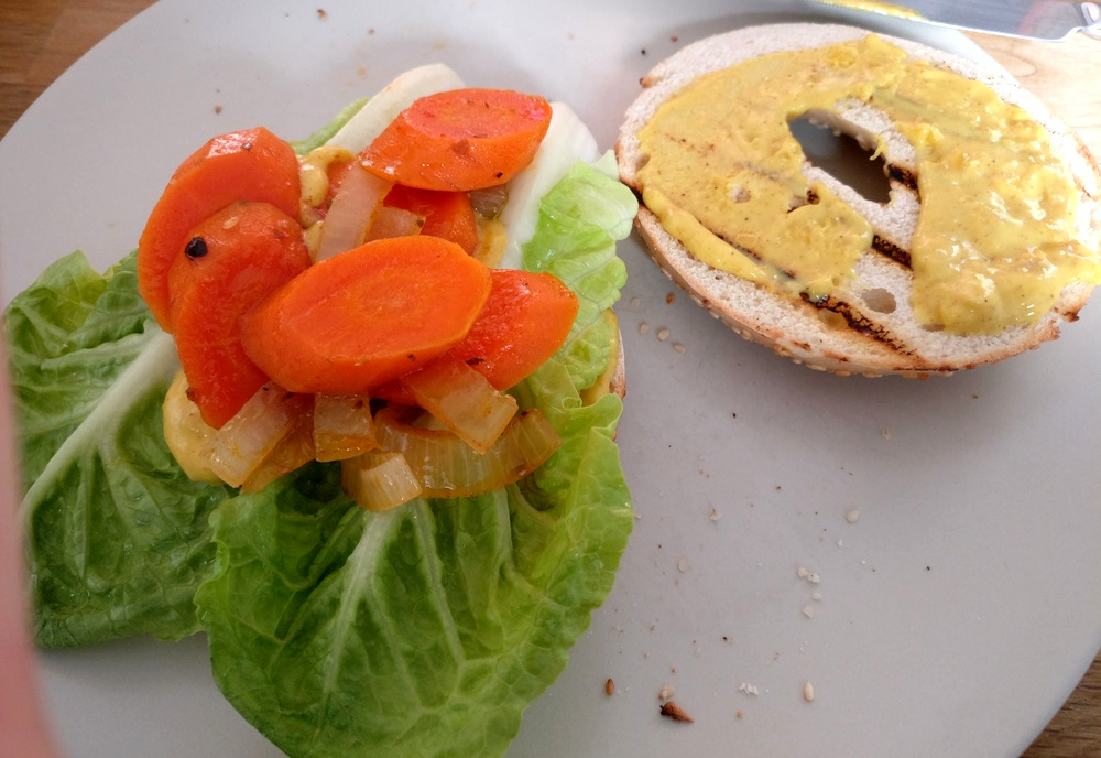 2 Bagel 1 Portion gefrorene Möhren (oder 2 - 3 frische) 1 Zwiebel Currysauce Olivenöl Ankerkraut Macho Muchacho Rub etwas grünen Salat