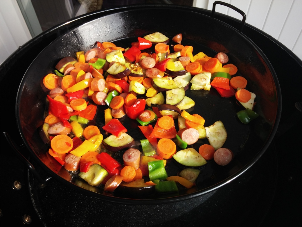 Als erstes habe ich das frische Gemüse kleingeschnitten und die Nudeln zum Kochen aufgesetzt (keine Sorge – Nudeln koche ich noch auf dem Herd 🙂 ). Nun hatte ich Zeit, mich um den Grill zu kümmern und die Gourmetpfanne vorzuheizen.