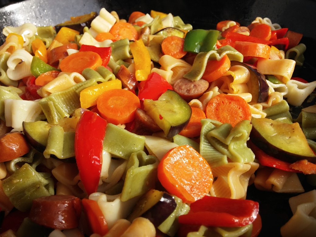Nach circa 10-15 Minuten war das Gemüse bissfest und die Nudeln waren in der Zwischenzeit auch fertig. Zeit, alles zusammenzugeben und mit etwas Pfeffer abzuschmecken. Durch die Wurst braucht es für unseren Geschmack kein zusätzliches Salz mehr.