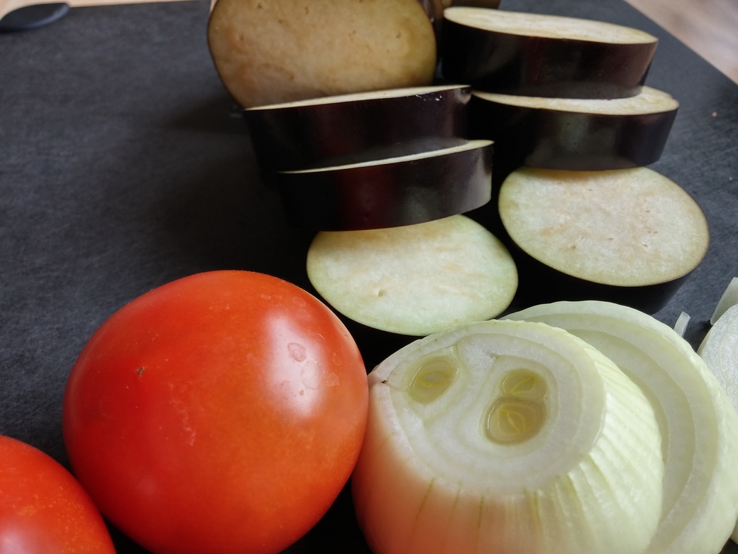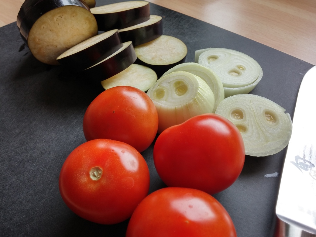 Als das Gemüse fertig war, habe ich die Zwiebel- und Auberginen-Scheiben in kleinere Würfel geschnitten. Durch das Grillen der ganzen Tomaten konnte man nun auch sehr leicht die Haut von den Tomaten abziehen, das Tomatenfleisch wurde ebenfalls in kleinere Würfel geschnitten.