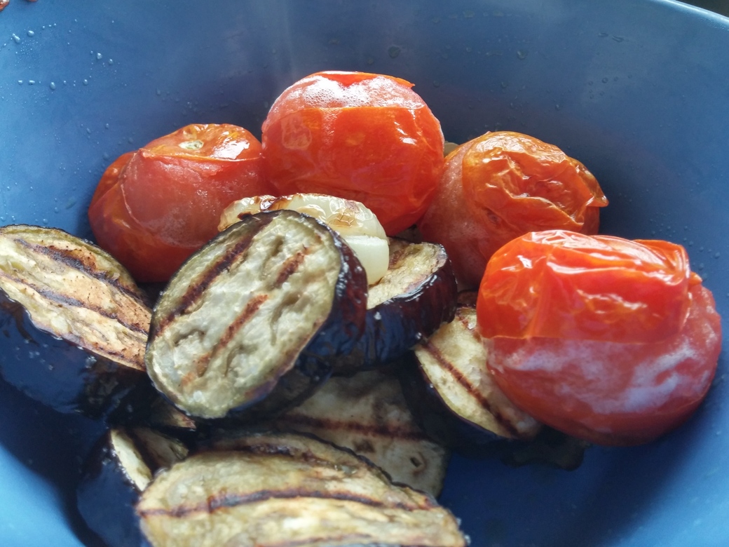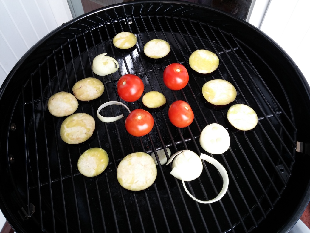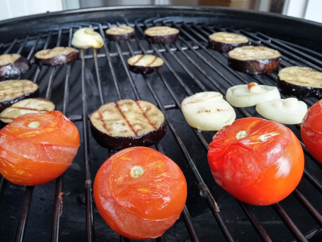 Die Aubergine und die Zwiebel habe ich in circa 1 cm dicke Scheiben geschnitten. Beides wurde dann mit Olivenöl bestrichen und ein kleines bißchen gesalzen. Zusammen mit vier Tomaten kamen dann diese Zutaten für 15 Minuten zum indirekten Grillen auf den vorgeheizten Outdoorchef. In der Zwischenzeit habe ich Nudeln für zwei Personen gekocht sowie eine Knoblauchzehe kleingehackt.