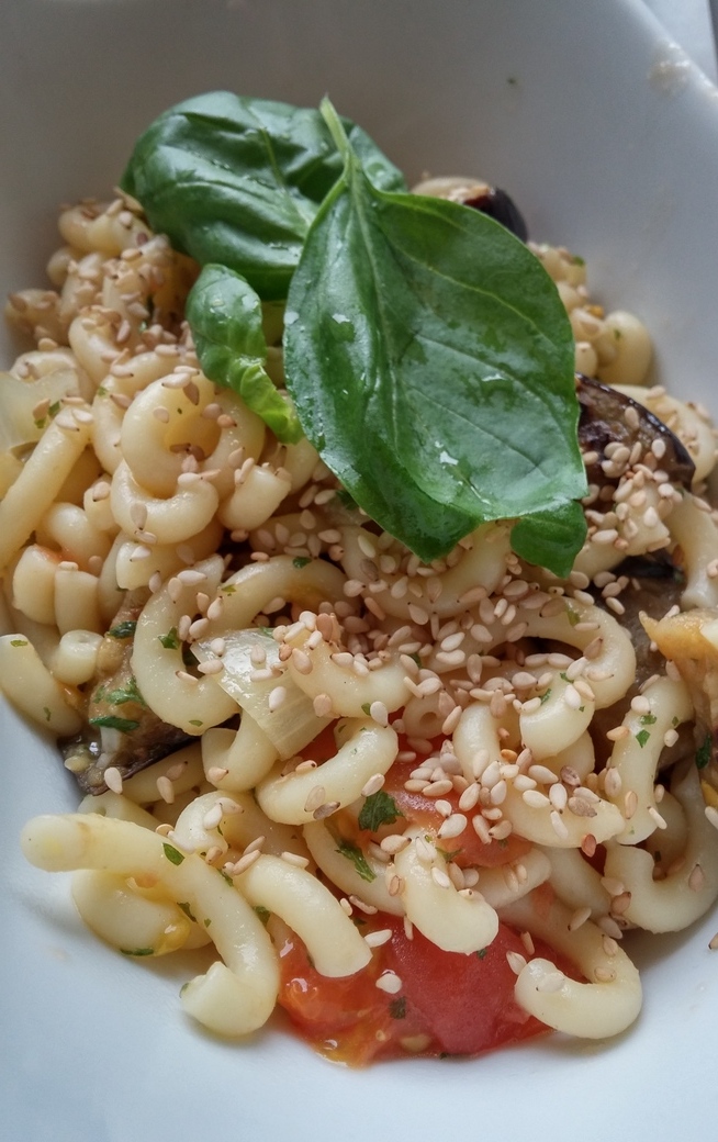 1 Aubergine 1 Zwiebel 4 Tomaten 1 Knoblauchzehe Sesamkörner Nudeln etwas Petersilie Olivenöl Salz