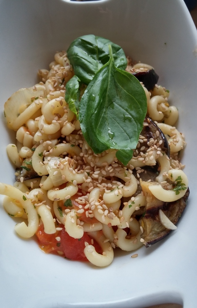 Nun das gegrillte Gemüse, den Knoblauch und die Nudeln miteinander vermengen und Salz und Petersilie abschmecken (ich habe heute TK-Petersilie genommen). Nun noch Sesam darüber streuen und fertig ist Pasta an gegrillten Tomaten, Zwiebeln und Auberginen!