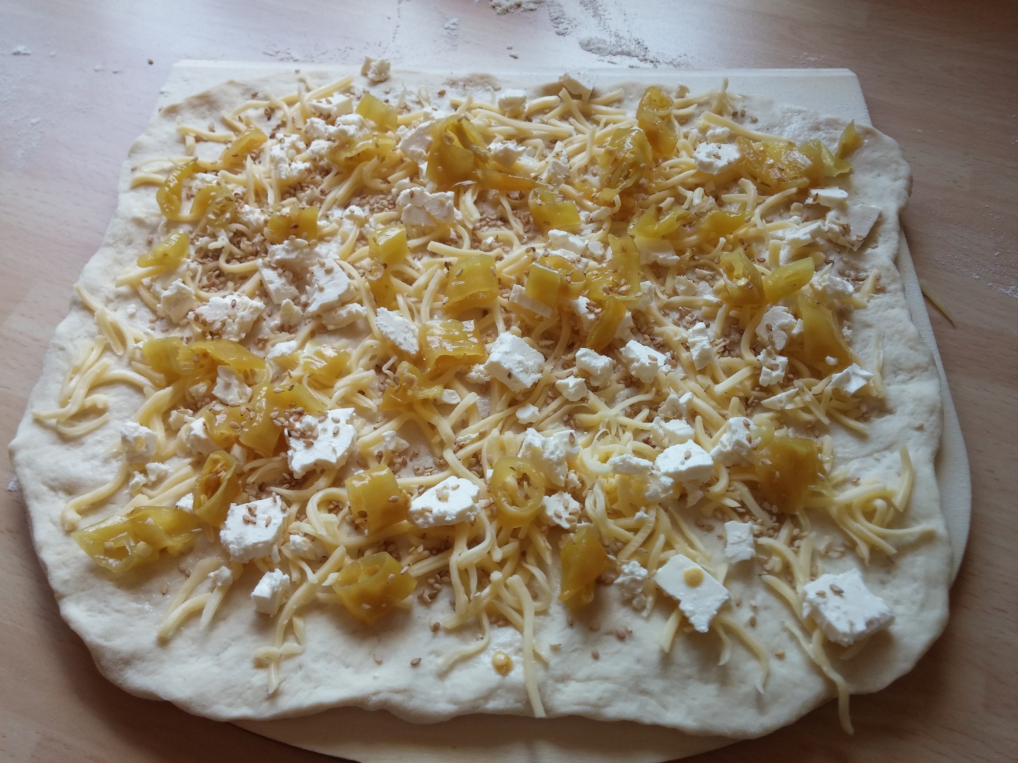 Für diese originelle Sesam-Feta-Pizza braucht es zunächst den ganz normalen Pizzateig, wie ihr ihn auch unter meiner Rezept-Rubrik findet. Desweiteren werden noch eingelegte Peperoni im Glas, geriebener Käse, Fetakäse und jede Menge Sesam benötigt.