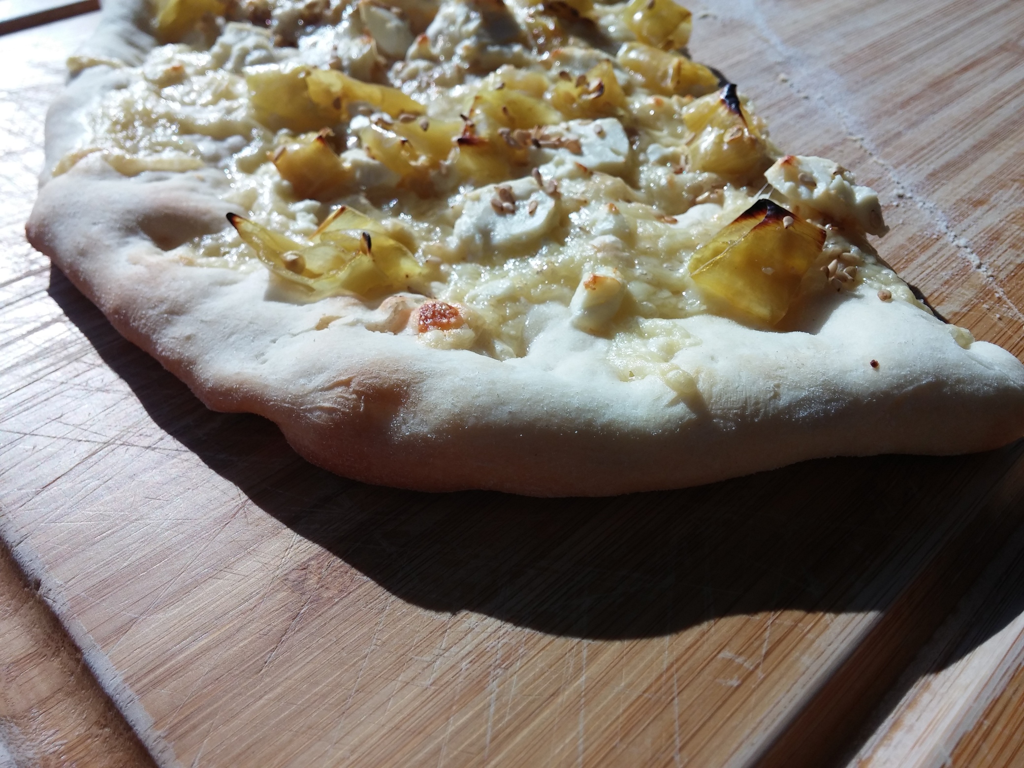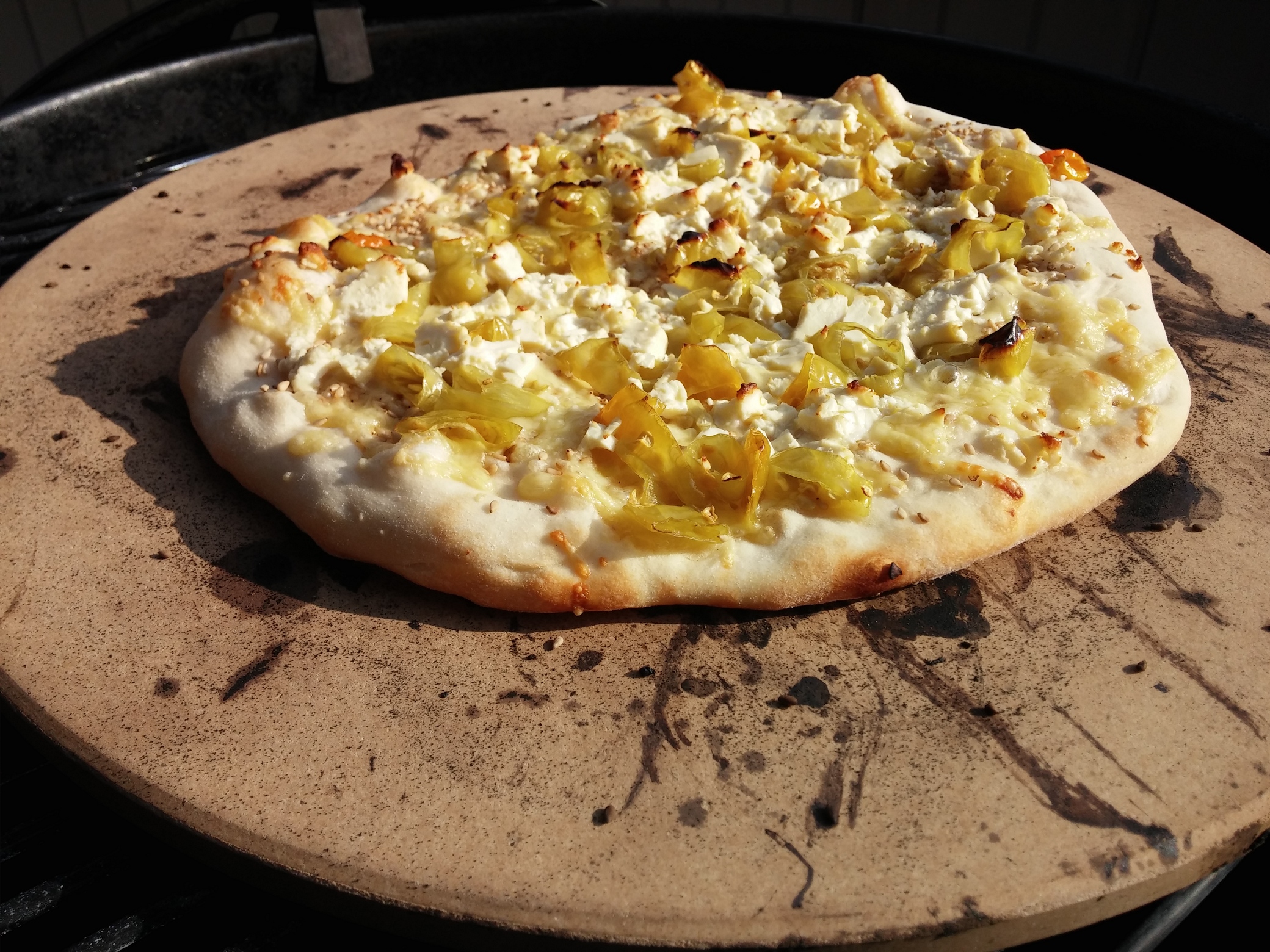 Da bei dieser Pizza das klassische Tomatensugo fehlt und ich ungerne eine total trockene Sesampizza machen wollte, habe ich einfach spontan etwas von dem „Peperoni-Wasser“ aus dem Glas auf dem Pizzateig verteilt. Dann folgten der geriebene Käse, die kleingeschnittenen Peperonis sowie der lose zerbröckelte Fetakäse. Zu guter Letzt dann Sesam, der reichlich aufgestreut werden sollte, da gerade der Sesam den Reiz dieser Pizza ausmacht. Dann ab für ca. 8 Minuten auf den tüchtig vorgeheizten Pizzastein.
