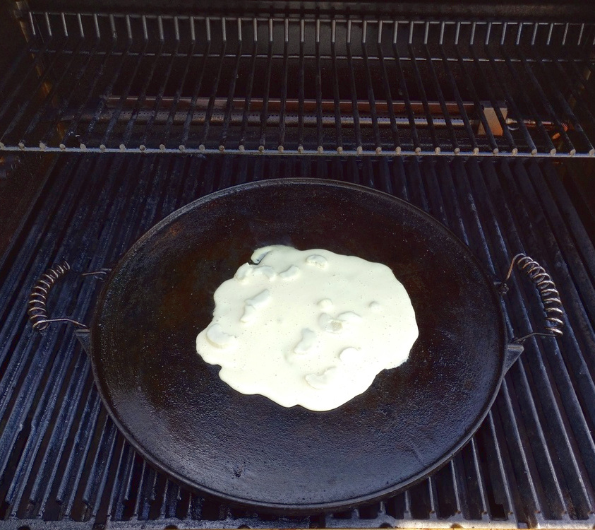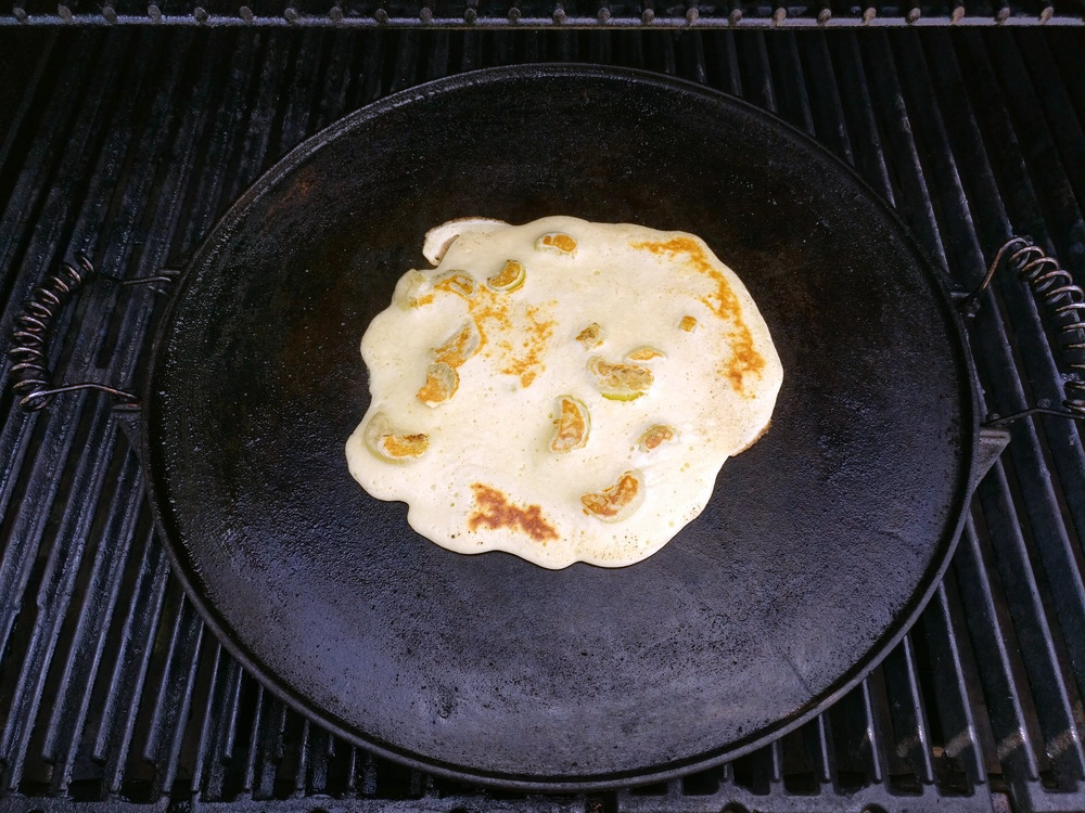 Bevor ich den Teig auf die heiße Plancha gebe, sprühe ich sie mit etwas Trennspray ein. Durch das Ölspray bekommt der Pfannkuchen eine schönere Farbe und klebt auch nicht an der Plancha fest. Die Grilldauer variiert je nach Belieben, ob ihr die Pfannkuchen eher dunkel oder hell mögt. Ich bevorzuge eine mittlere Bräunung 🙂