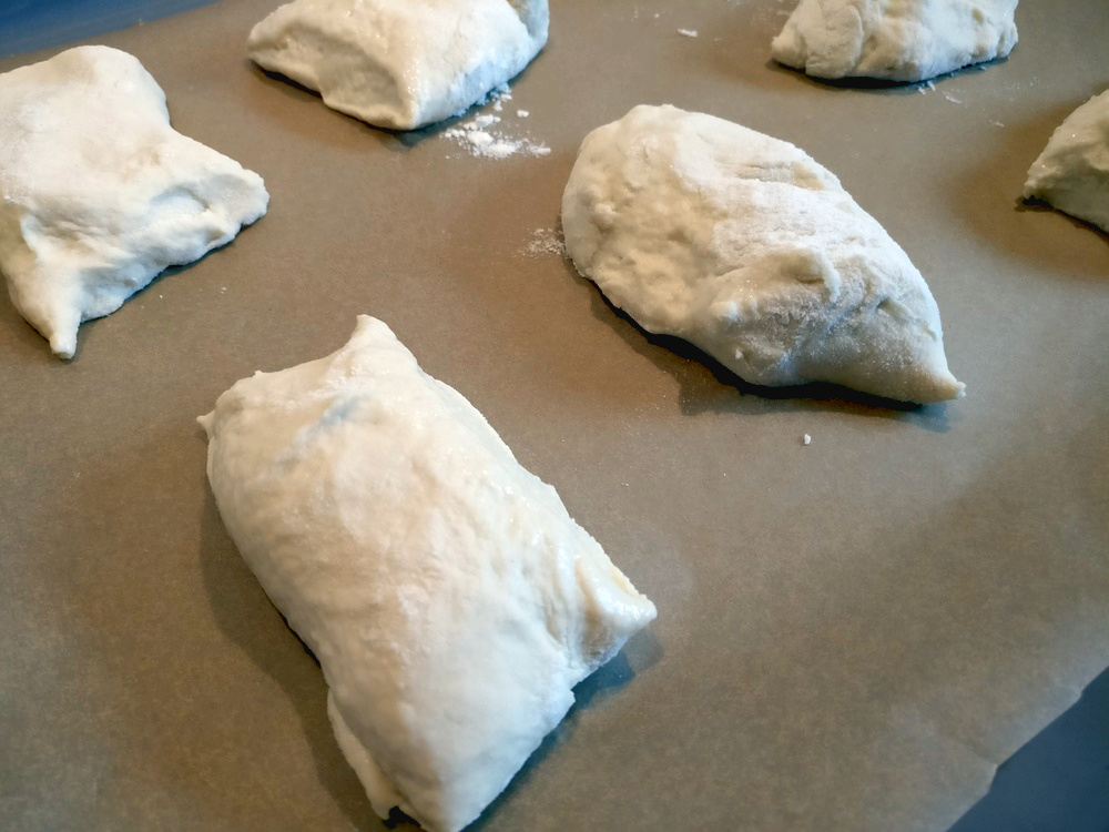 - Den feuchten Teig mit einem Teigschaber in Brötchen zerteilen und aufs Blech geben. Brötchen nicht zu sehr kneten!