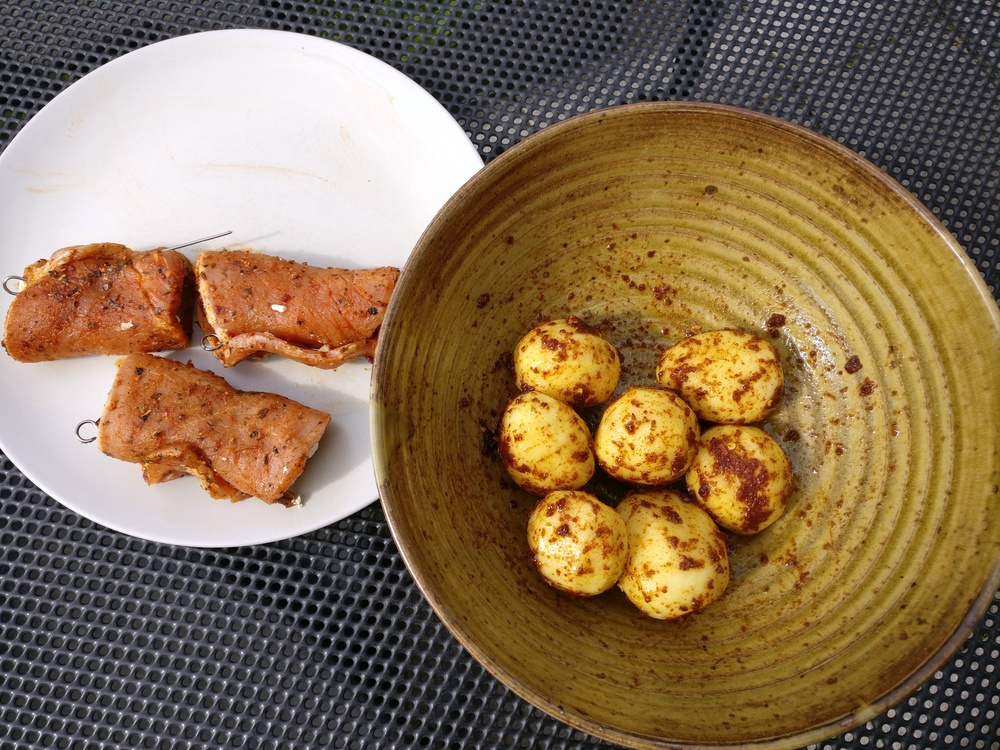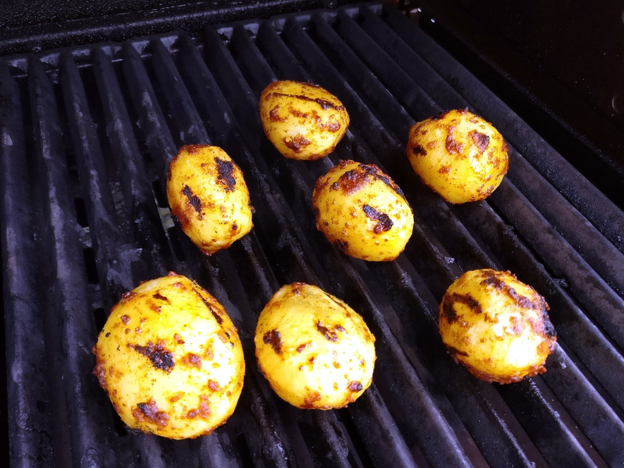 Ich grille zunächst die Fächerkartoffeln auf dem vorgeheizten Broil King, da sie am längsten brauchen. Bei einem Viertel Leistung grille ich die Kartoffeln von allen Seiten an. Der Patatas Bravas Dip enthält viel Paprika, sodass ich entsprechend aufpassen muss, damit nichts verbrennt.