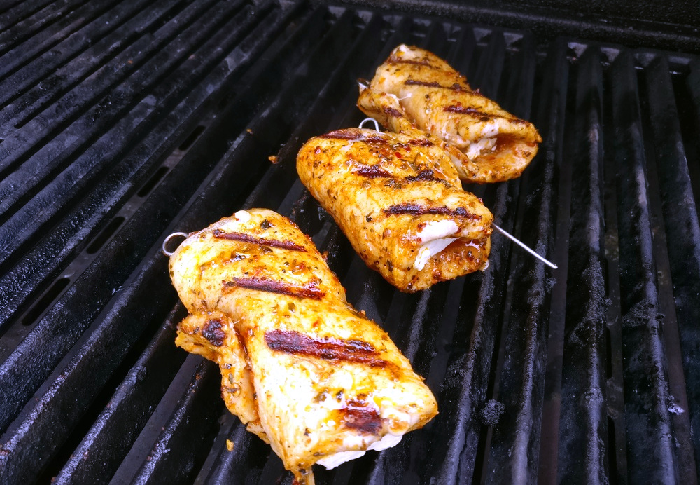 Morgens habe ich als erstes die Schweinelachssteaks aus dem TK-Fach genommen und auftauen lassen. Sobald sie aufgetaut waren, habe ich sie gewaschen und mit dem Ankerkraut Macho Muchacho BBQ Rub und etwas Öl einmariniert. Der Rub muss nun mindestens drei Stunden (im Kühlschrank) einziehen. Kurz vorm Grillen habe ich dann das Fleisch aus dem Kühlschrank genommen, damit es Raumtemperatur annimmt. Vom Fetakäse schneide ich drei Scheiben ab, jeweils circa 0,5 cm dick. Ich wickele nun die Scheibe Feta in das Fleisch ein und verschließe es mit einer Rouladennadel.