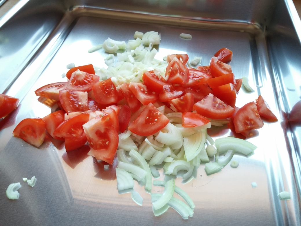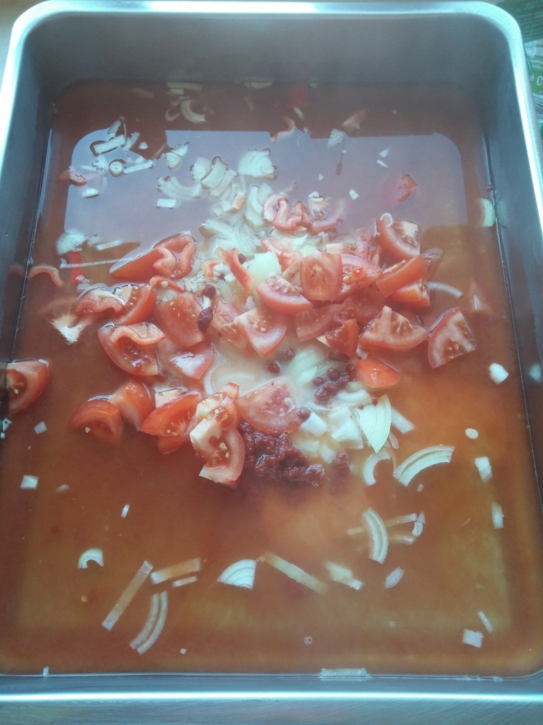 In diese Form kommen also als erstes die Zwiebel, Tomaten, Tomatenmark, etwas Ketchup, etwas Brühepulver, Salz, Patatas Bravas Gewürz von Ankerkraut und etwas Pfeffer als Sud zum Garen. Achja, und nicht zu vergessen auch einige Chilifäden. Sie sind nicht sonderlich scharf, aber machen sich optisch sehr schön. Das Ganze habe ich mit etwas heißem Wasser (geschätzt ca. 250 ml) aufgegossen und zur Verfeinerung einen Schuss Milch dazugegeben. Alles verrühren und fertig ist der Sud.