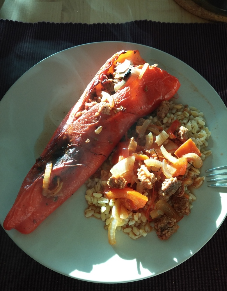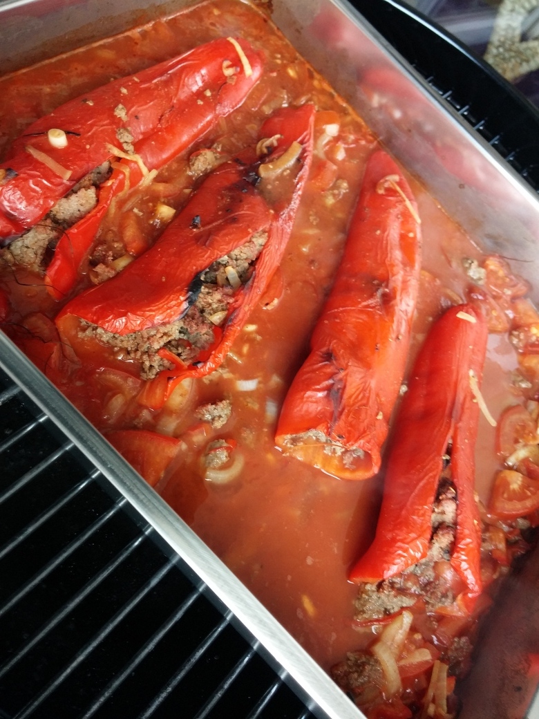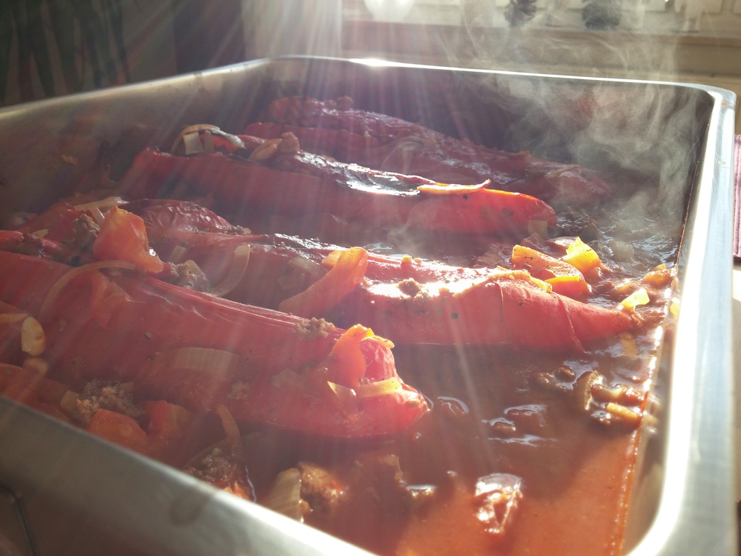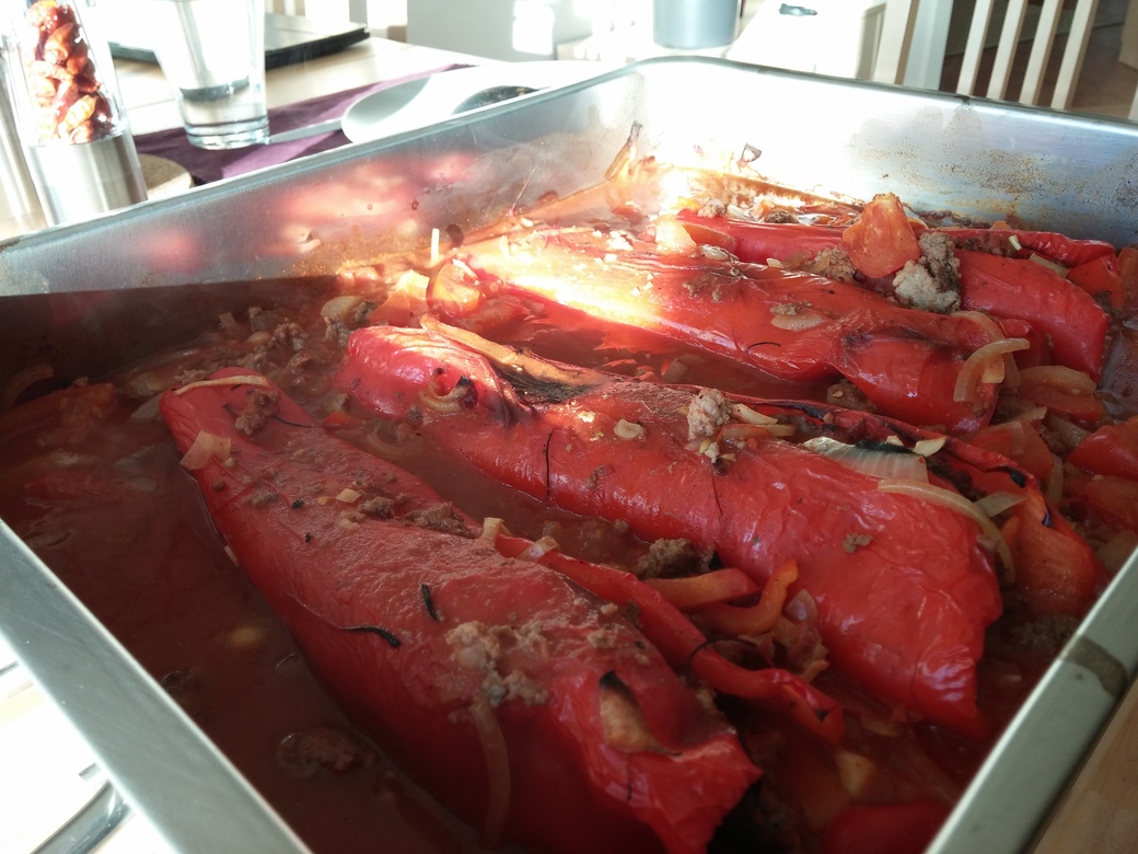 Gefüllte SpitzpaprikaZum Sonntag darf gerne etwas Besonderes aufgetischt werden, zum Beispiel gefüllte Spitzpaprika. Nachdem beim Einkaufen große rote Spitzpaprika in den Einkaufswagen gesprungen sind, stellte sich nämlich die Frage nach der passenden Verarbeitung und Zubereitung. Da wir beide gerne gefüllte Paprika mögen und wir das schon lange nicht mehr gegessen hatten, konnte diese Frage schnell beantwortet werden.