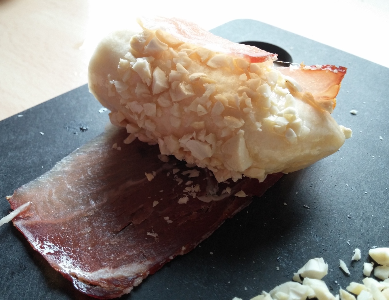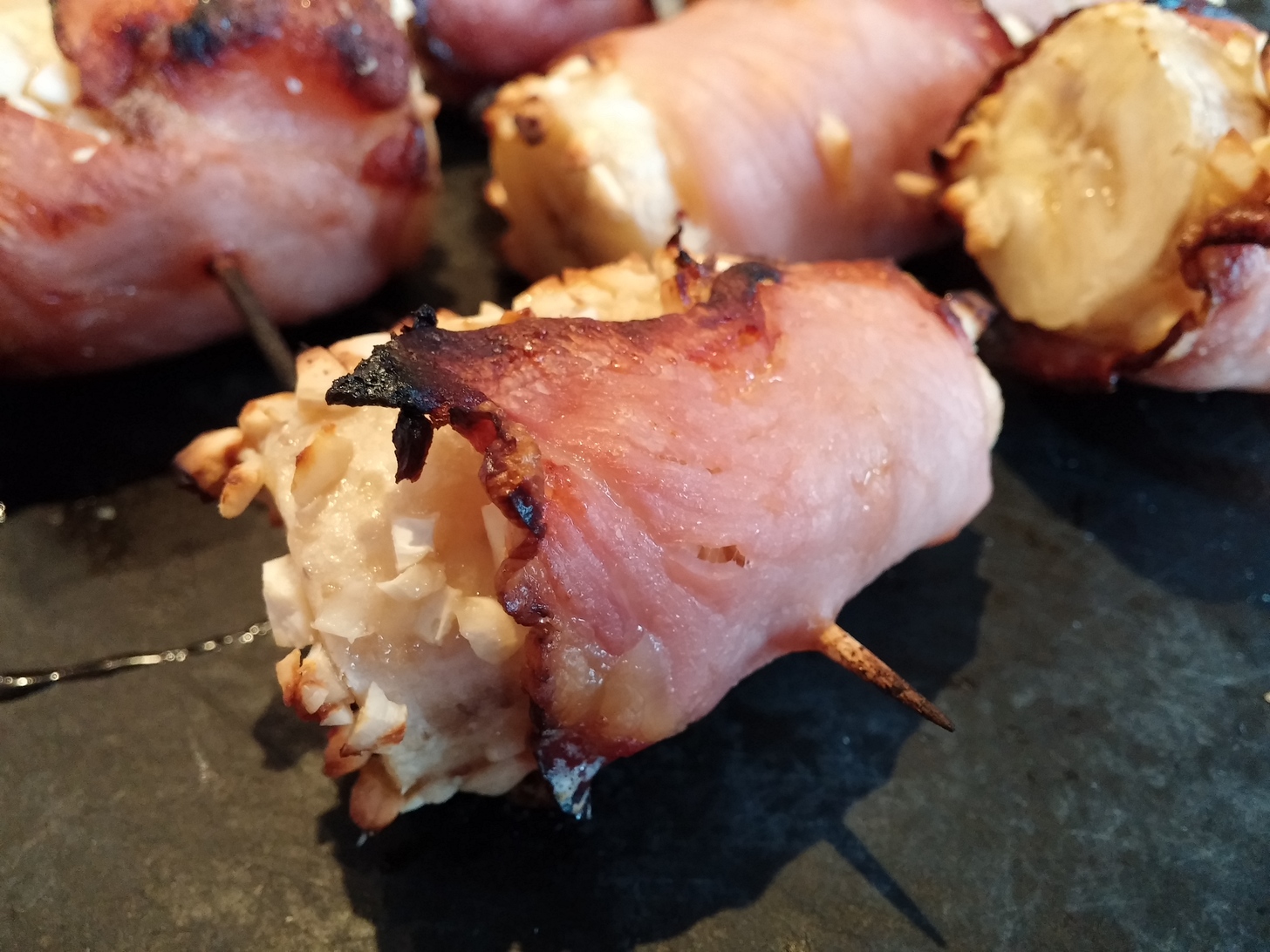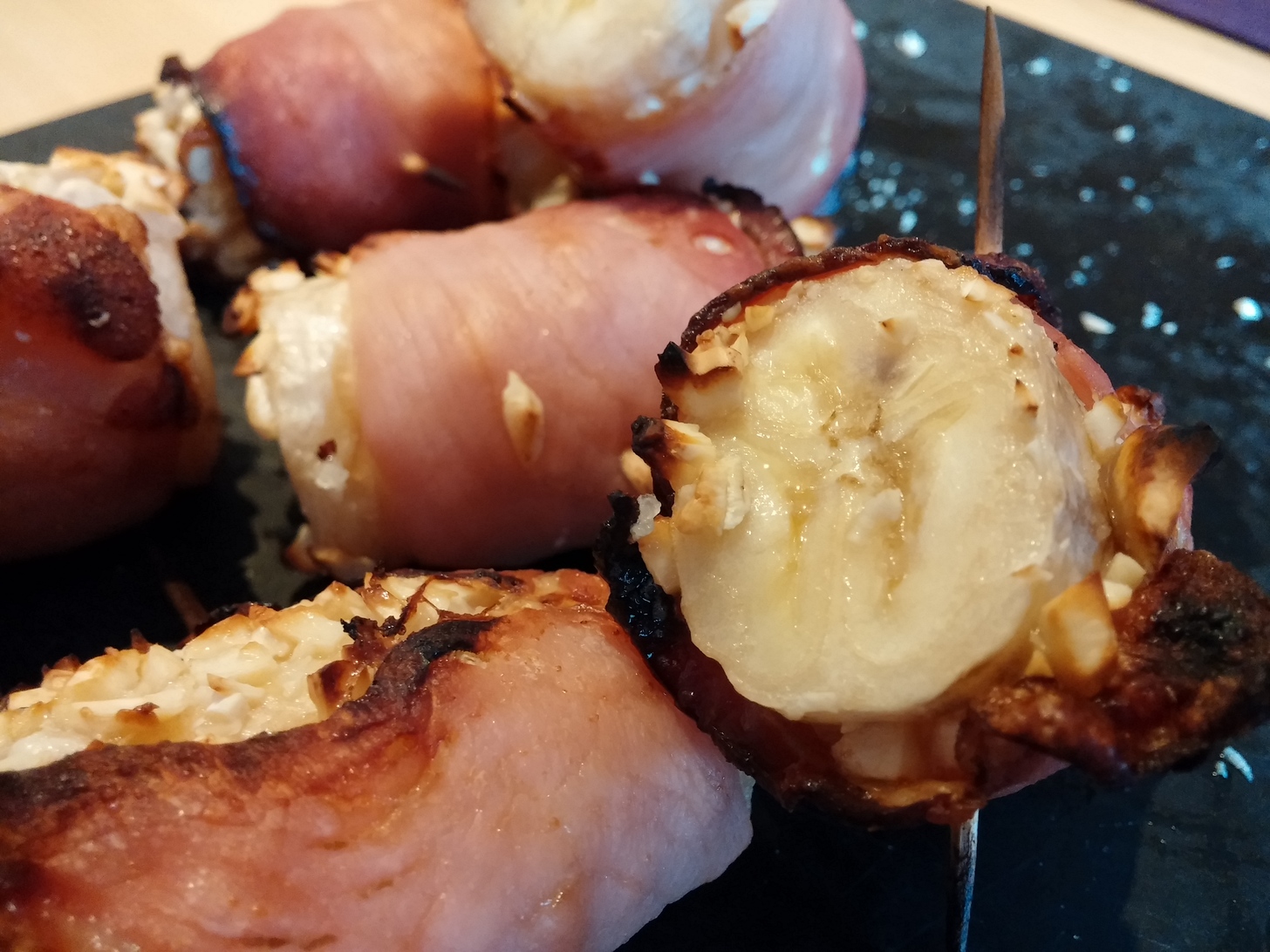 Da unsere Frühstücksbrötchen heute Morgen schon ziemlich gut satt gemacht haben und wir den Rest heute Abend noch essen wollen, gab es heute Mittag einen kleineren Hauptgang – und zwar Bananen im Speckmantel mit Honig und Cashewkernen.