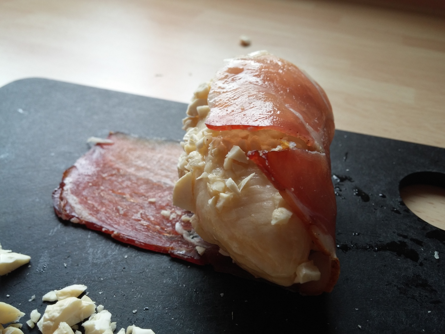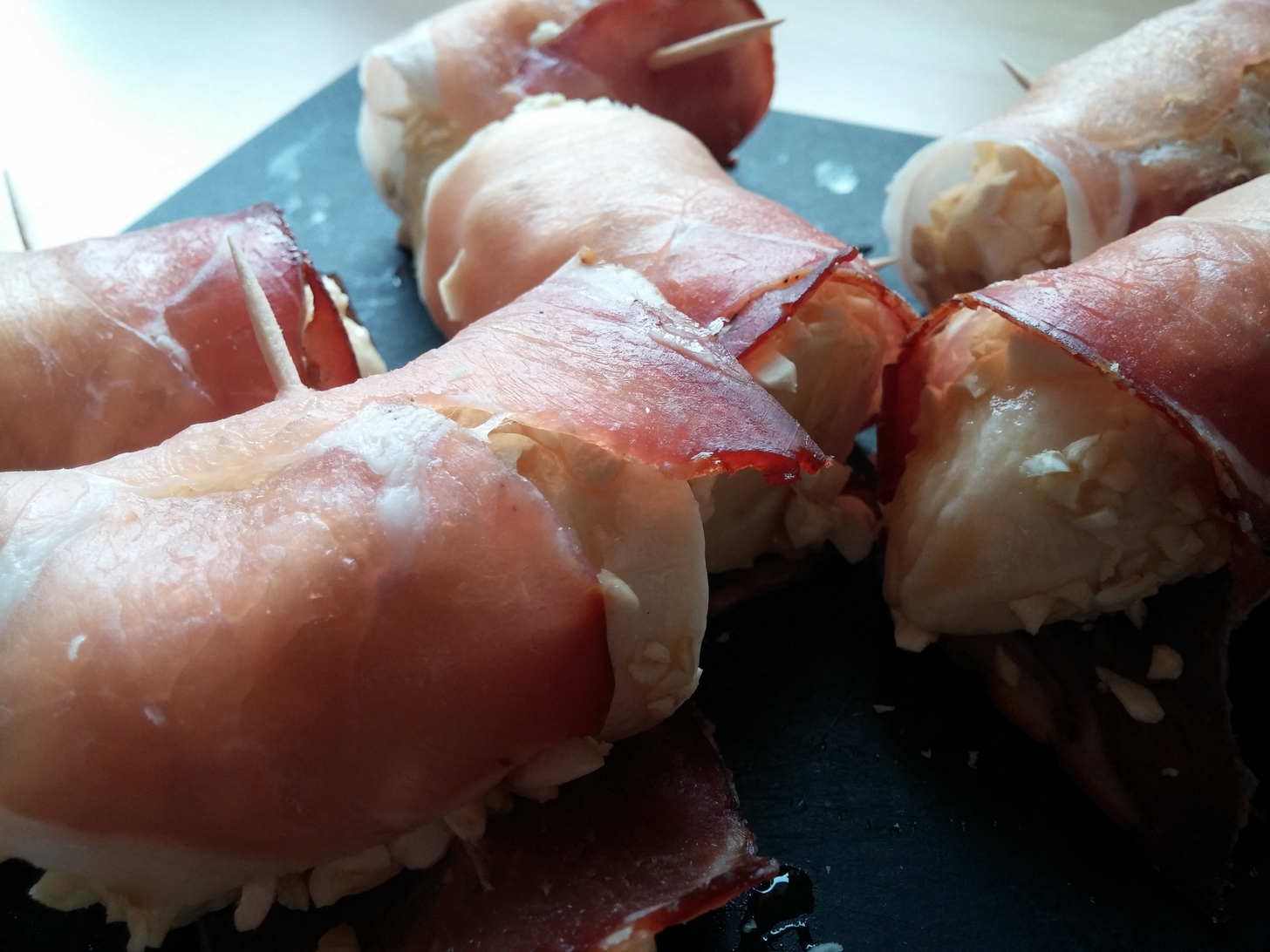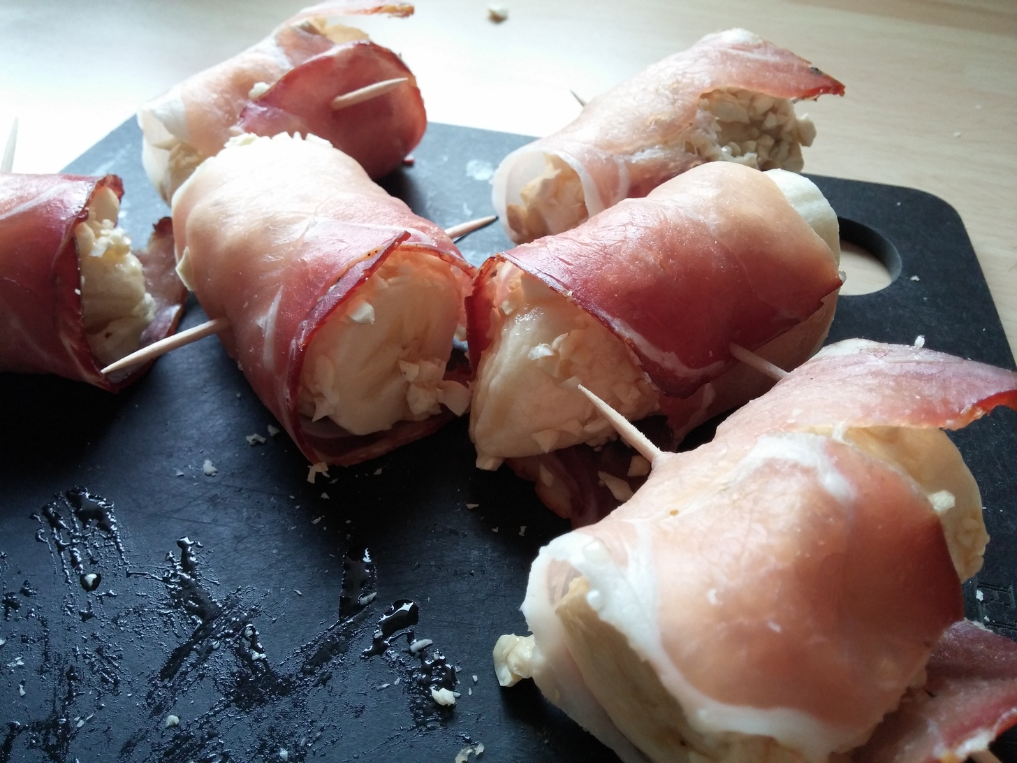 Da unsere Frühstücksbrötchen heute Morgen schon ziemlich gut satt gemacht haben und wir den Rest heute Abend noch essen wollen, gab es heute Mittag einen kleineren Hauptgang – und zwar Bananen im Speckmantel mit Honig und Cashewkernen.