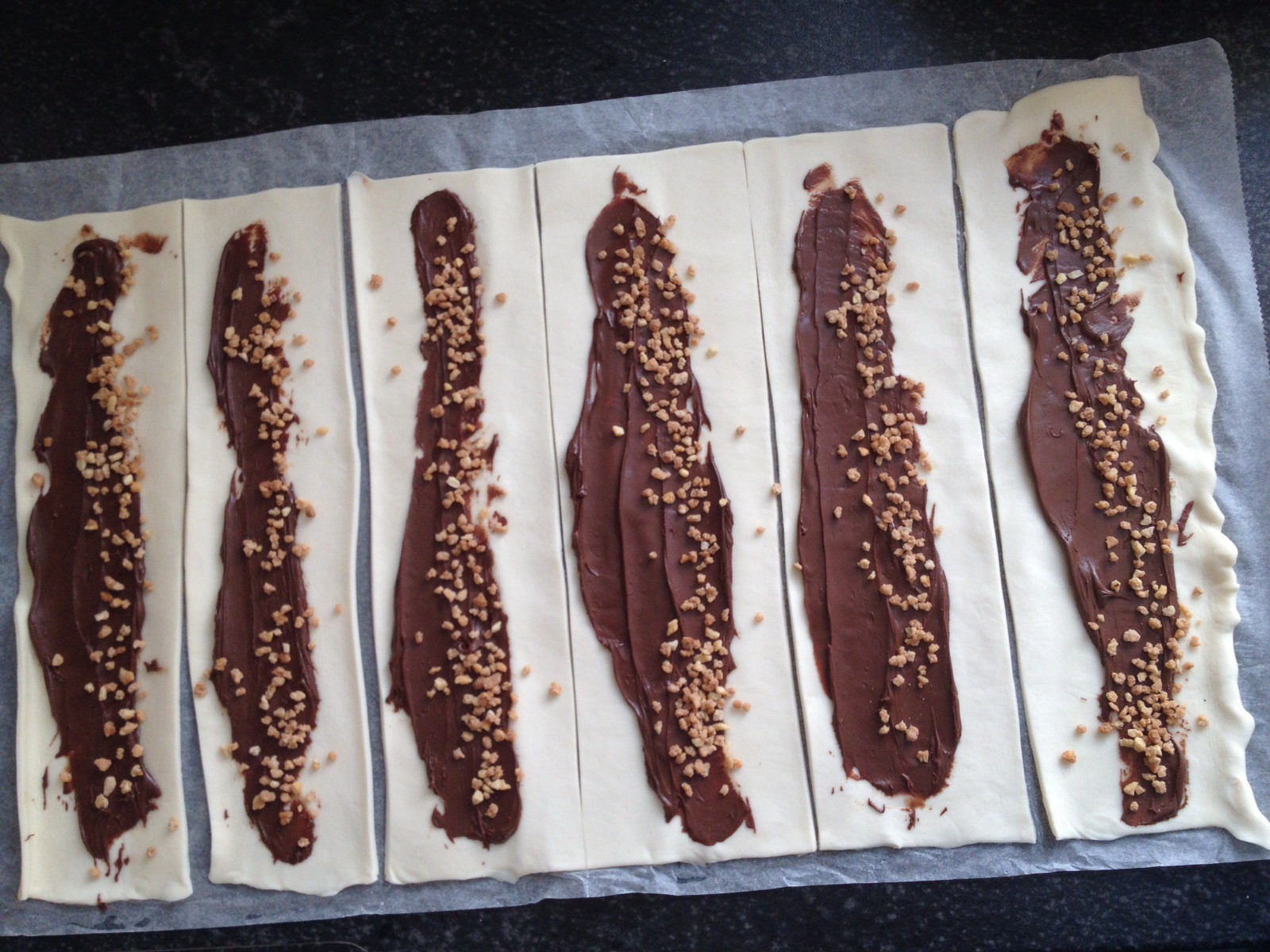 Vor dem nächsten Schritt könnt ihr den Grill schon mal auf voller Leistung vorheizen, damit das Grillrost ordentlich durchwärmt. Zehn Minuten reichen hier aus. Zurück in der Küche jetzt die beiden Rollen Blätterteig auspacken und jeweils in sechs Streifen teilen. Die Streifen je nach Geschmack mit Marmelade oder Nutella bestreichen und ggf. etwas Krokant draufgeben. In unserem Fall haben wir sechs Streifen mit Nutella und sechs Streifen mit selbstgemachter Apfel-Rhabarber-Bananen-Marmelade bestrichen.