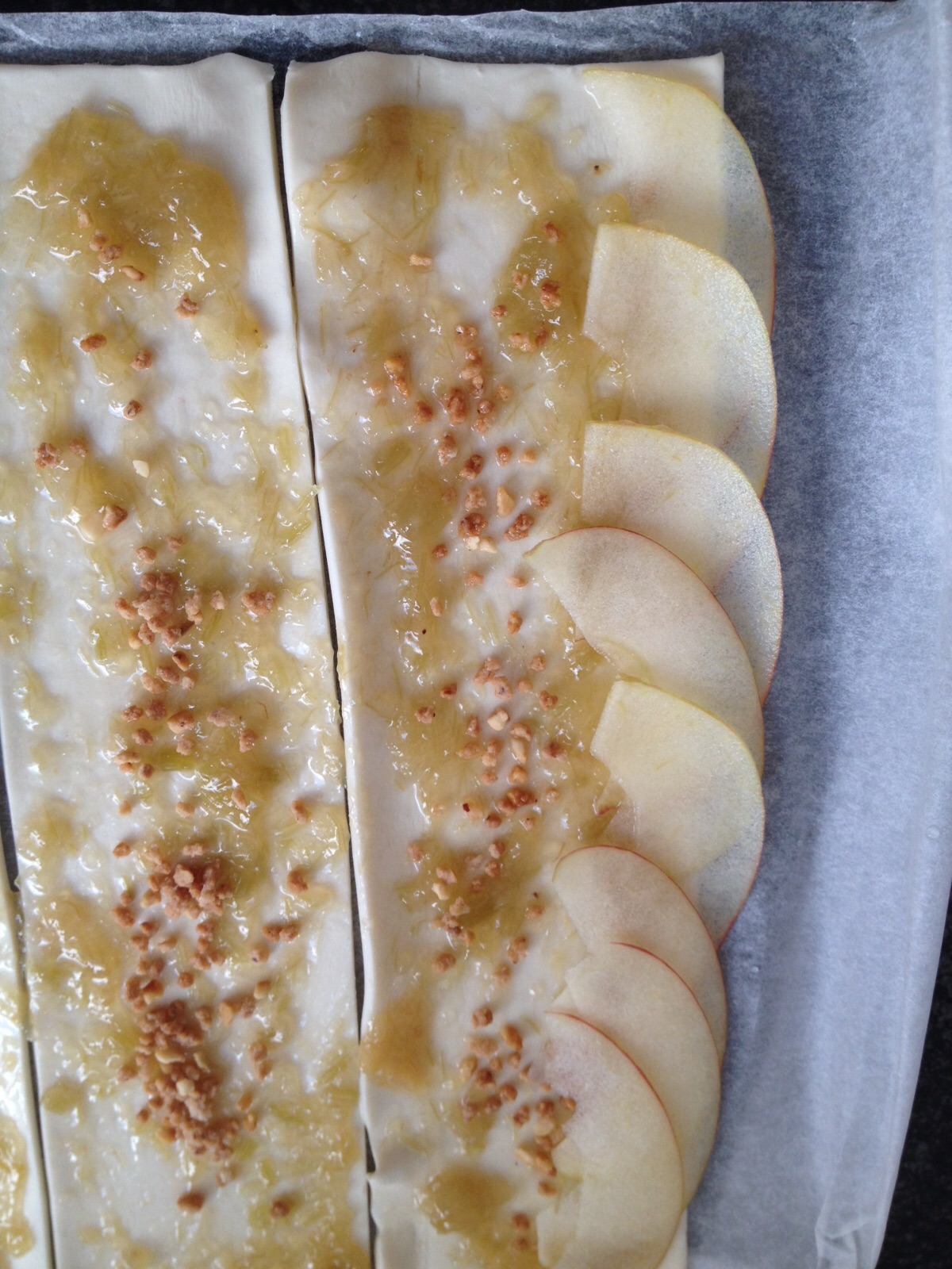 Im nächsten Schritt werden die Apfelscheibchen auf den Streifen gelegt – und zwar so, dass der Bogen (also die Seite mit der Schale) etwas über die Teigkante herausragt. Idealerweise sieht das dann so aus: