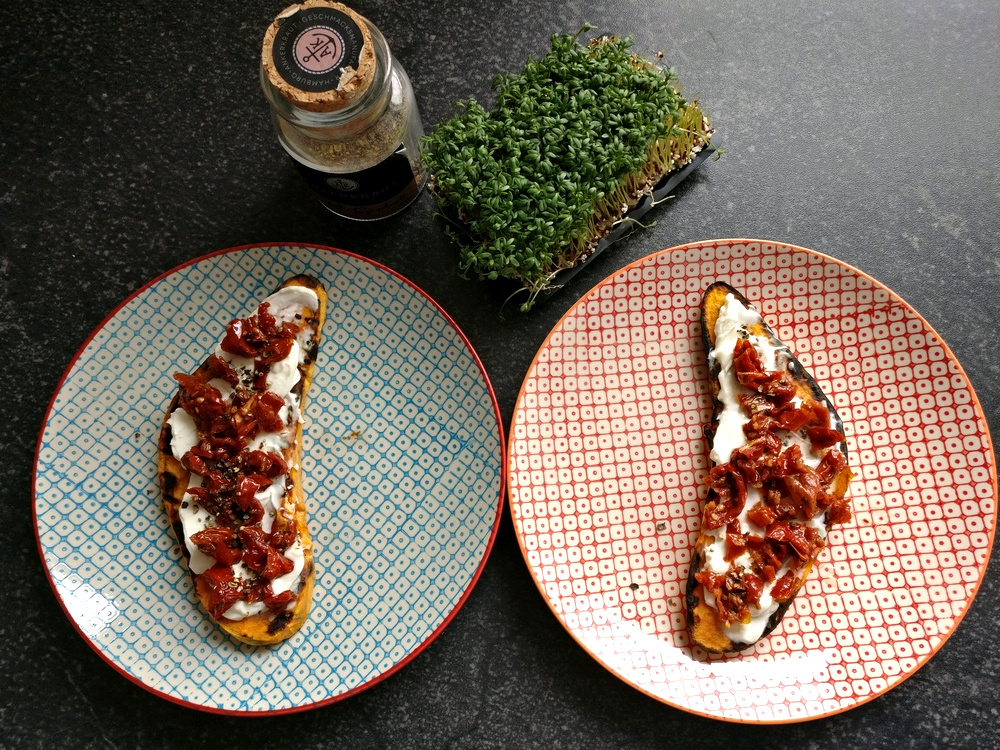 Wow, die Süßkartoffel-Toasties sind definitiv ein Highlight der „schnellen Grillküche“! Der kräftige Geschmack der getrockneten Tomaten passt hervorragend zu der Süße der Süßkartoffel und ihrer weichen Konsistenz. Dazu die Würze der Kresse und der Frischkäse – ich bin ehrlich gesagt vom Geschmack und der Raffinesse dieses einfachen Rezeptes begeistert!