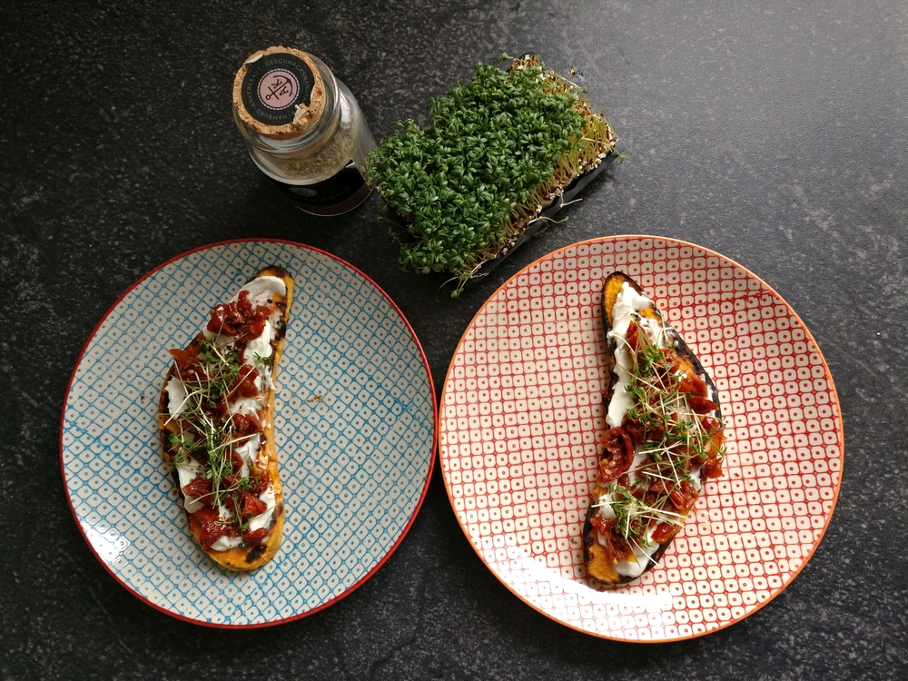 Nach ca. 10-15 Minuten haben die Süßkartoffel-Scheiben eine leichte Röstung und wenn ich mit der Grillzange vorsichtig dagegen drücke, merke ich, dass die Scheiben innen weich geworden sind. Prima, dann kann also das Belegen der Süßkartoffel-Toasties beginnen: Einfach mit Frischkäse bestreichen, Tomatenstücke und Pfeffer draufgeben und zum Schluss mit etwas Kresse garnieren. Fertig!