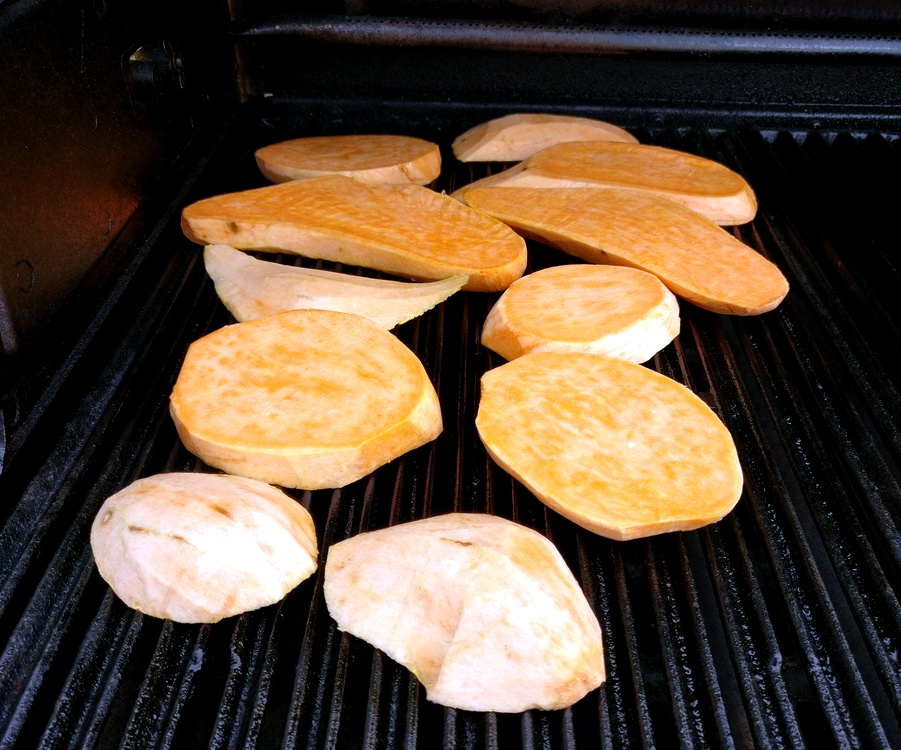 Damit mir die Süßkartoffel-Scheiben nicht verbrennen, habe ich den Broil King nur auf halber Leistung vorgeheizt. Zum Grillen reduziere ich die Hitze noch ein klein wenig mehr und lege dann Süßkartoffel-Scheiben auf den gusseisernen Grillrost. Die Süßkartoffel-Toasties müssen nun von beiden Seiten bei moderater direkter Hitze angrillen und von Zeit zu Zeit gewendet werden.