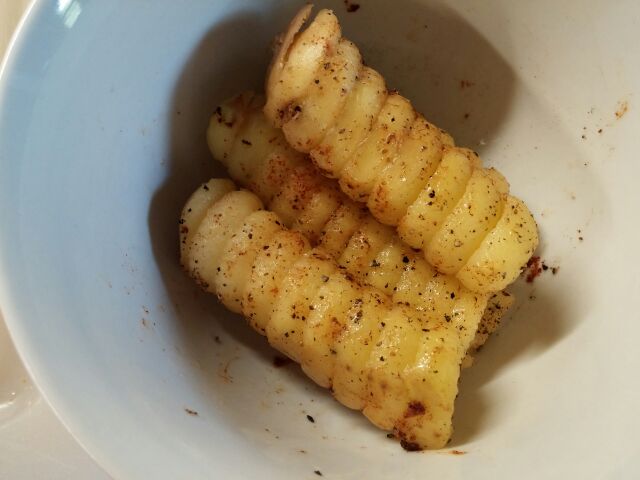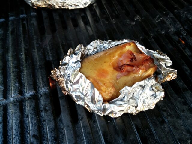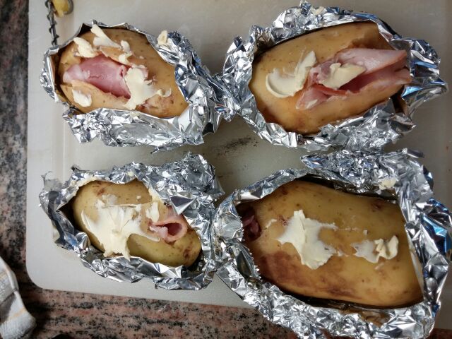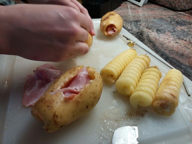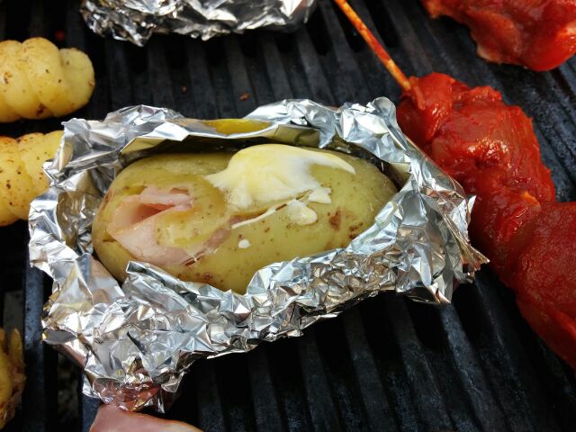 Während die Spiralen mit Öl, einer Pfeffermischung und Salz mariniert werden, können die hohlen Kartoffeln prima gefüllt werden. Dazu hat Kata die hohlen Kartoffeln mit etwas Schmelzkäse und Schinken gefüllt und in eine Alufolie gepackt. Kleiner Schlag Margarine drauf, und schon kann alles auf den Grill.