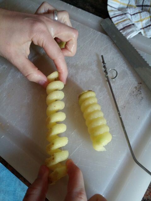 Dazu Kartoffeln waschen und abtrocknen. Dann mit dem Werkzeug eine Kartoffel anpicksen und langsam hineindrehen. Durch das Gewinde am Werkzeug zieht sich der Schneider nun in die Kartoffel. Man dreht so lange, bis das Werkzeug am anderen Ende der Kartoffel wieder raus kommt. Dann einfach den Schneider heraus drücken. Nun nur noch die Spirale aus der Kartoffel drücken und fertig!