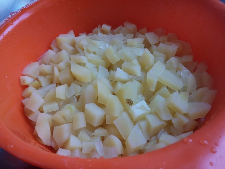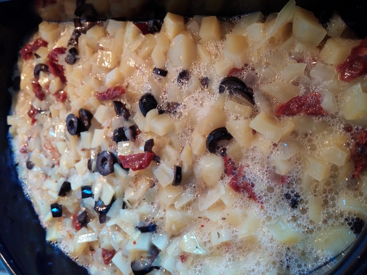 4-5 große Kartoffeln 4 Eier 1 Zwiebel getrocknete Tomaten Oliven 1 TL Brühe Pfeffer und Salz