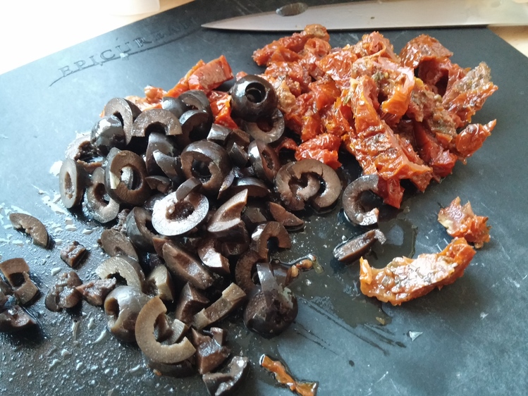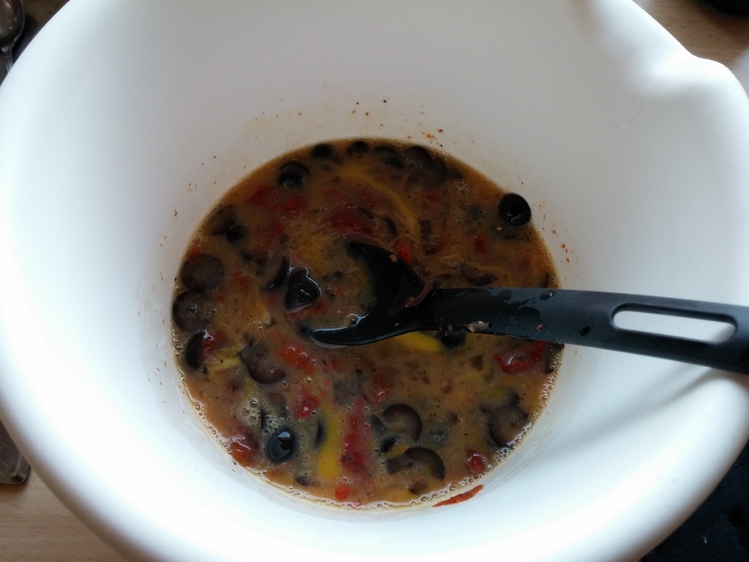 Das Tortilla-Rezept findet ihr in diesem Blog-Eintrag, mit dem Unterschied, dass ich hier keine Wurst verwendet habe, sondern den Rest Oliven und getrocknete Tomaten. Ihr braucht also nur: