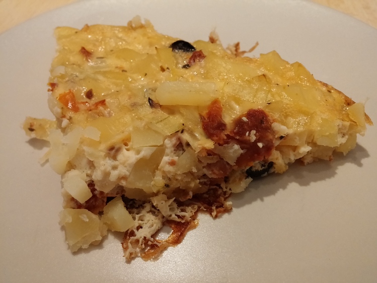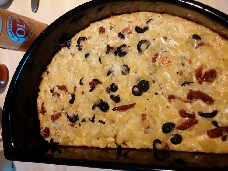 Kartoffeln und Zwiebel würfeln und für zehn Minuten in Brühe kochen, danach kurz abkühlen lassen. Währenddessen die Eier verquirlen und die klein geschnittenen Oliven und Tomaten unterrühren und mit Pfeffer und Salz würzen. Dann Kartoffeln und Zwiebeln mit der Eier-Oliven-Tomaten-Mischung vermengen und in eine gefettete Form (ich habe meinen Outdoorchef Gourmet-Halbmond verwendet) geben. Das Ganze indirekt bei ca. 200 Grad für 30 Minuten ausbacken, bis beim Einstechen mit einer Nadel kein Teig kleben bleibt.