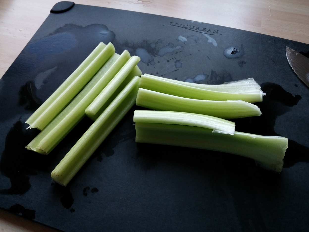 Zeit, um sich um das Fleisch und den Sellerie zu kĂŒmmern. Fangen wir mit dem Filet an. Das habe ich unter kaltem Wasser abgespĂŒlt und dann mit KĂŒchenpapier trocken gerieben.  Als nĂ€chstes folgten eine anstĂ€ndige Massage mit einem Rub von Jamie Oliver (laut Packungsbeschreibung mit rauchiger Note, was ich gerne mag). Der Sellerie wurde ebenfalls geputzt und in circa zehn Zentimeter lange StĂŒcke geschnitten. Es folgte auch hier eine Massage (wenn auch weniger intensiv als beim Filet) mit etwas Olivenöl, Salz und der 9-Pfeffer-Symphonie von Ankerkraut.