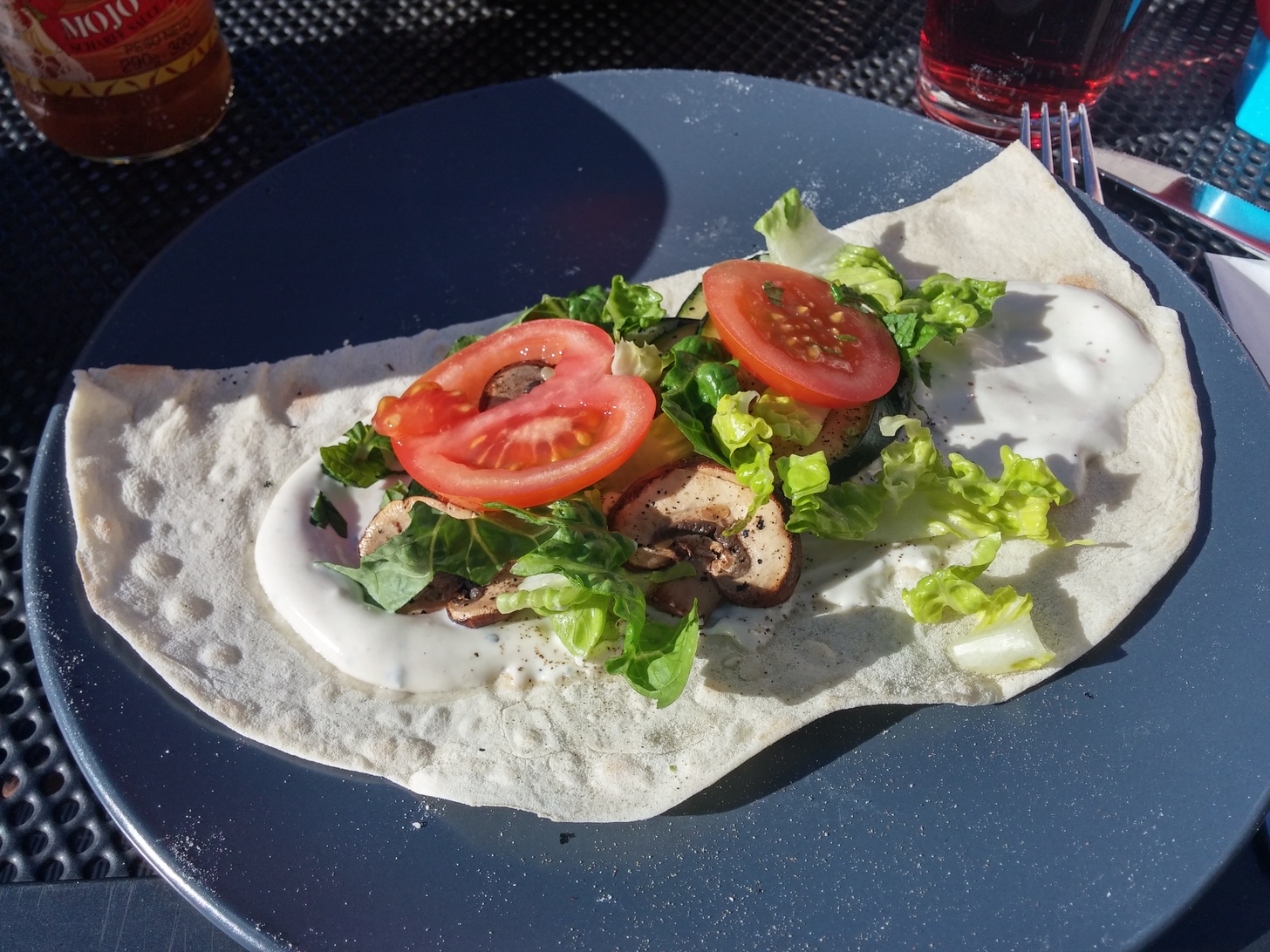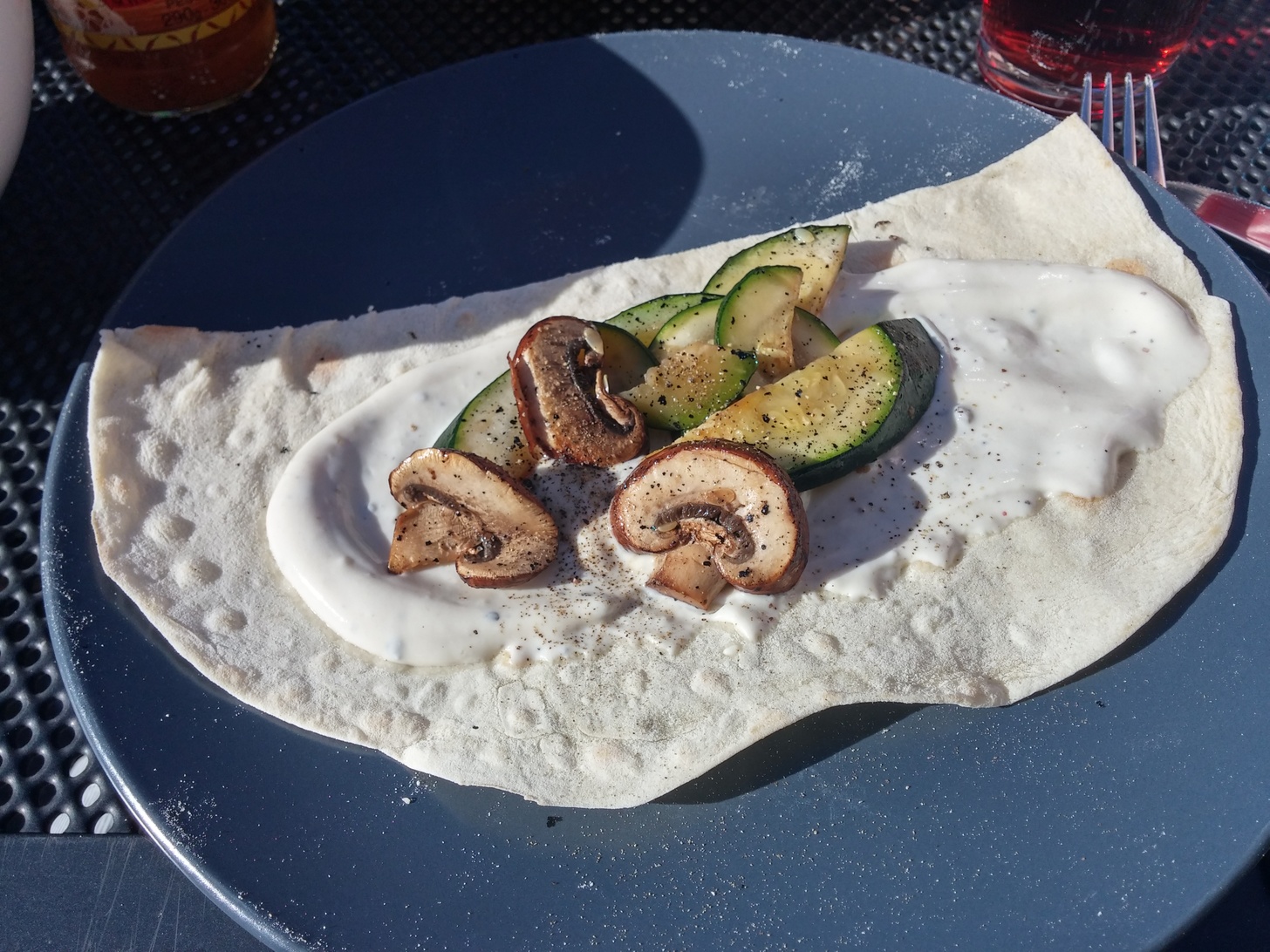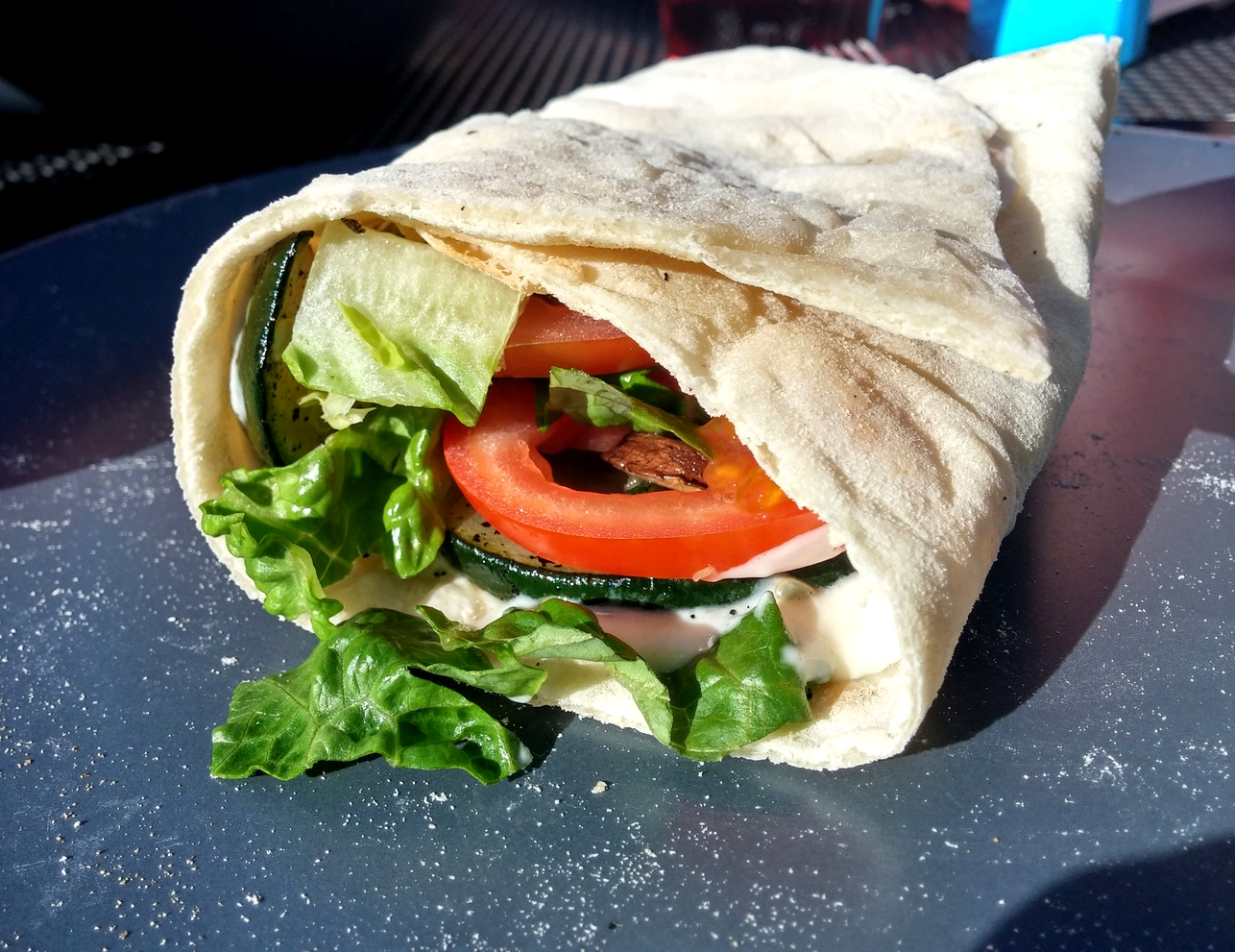 Wenn die Manouche fertig ist, kann sie belegt werden. Ich habe meine Manouche dazu mit der Tahin-Sauce bestrichen und dann das Grillgemüse in die Mitte gelegt. Darauf etwas Salat, Tomaten und Minze. Wer mag, kann noch mit Pfeffer oder Chili etwas Schärfe einbringen. Anschließend rolle ich das Ganze vorsichtig zusammen und fertig ist meine Manouche!