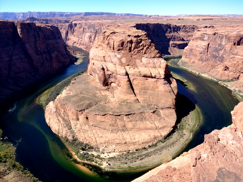 Am Lake Powell steht vor allem Wassersport im Vordergrund – schon lustig, wenn man durch die Wüste fährt und einem viele Pickup-Trucks mit Bootsanhängern entgegenkommen! In den Lake Powell fließt auch der Colorado-River. Nahe der Stadt Page findet sich auch der Horseshoe Bend, ein hufeisenförmiger Mäander des Fluss, der sich circa 300 m tief in das Gestein gegraben hat. Sehr beeindruckend – und nur mit Vorsicht zu genießen, denn das Felsplateau des Aussichtspunkts verfügt über keine Geländer!