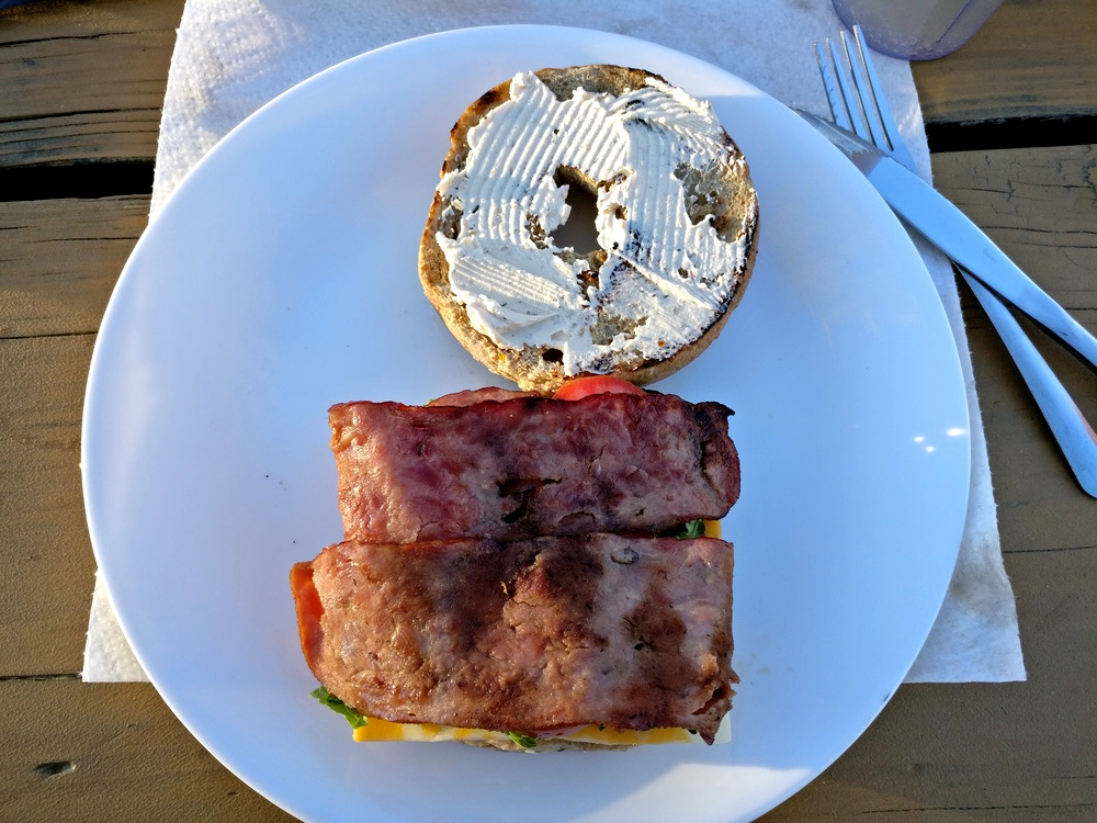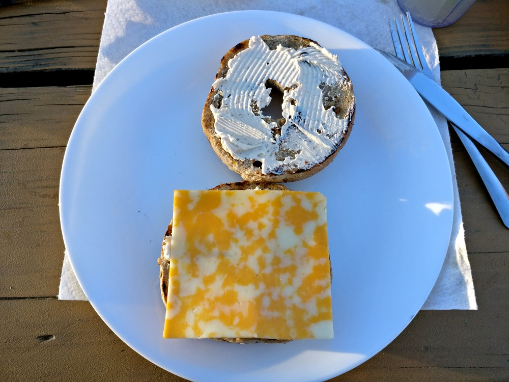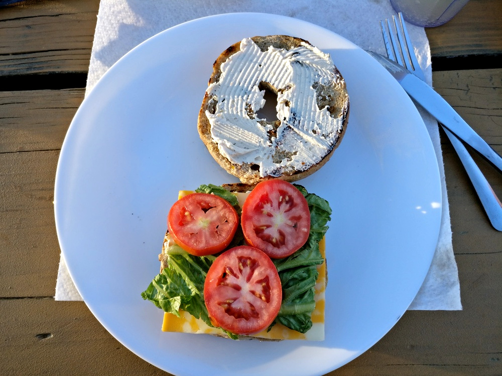 1 Stellplatz auf dem Wahweap Campground :-) 2 Multigrain Bagels 1 Tomate 2 Scheiben Cheddar 6 Streifen Truthahn Bacon 2-3 Blätter Romanasalat etwas Frischkäse