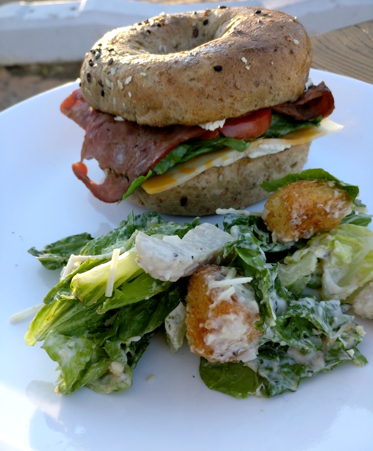Der Wahweap Bacon Bagel schmeckt mir sogar noch besser als der Grand Canyon Zucchini Bagel. Das liegt vor allem am gegrillten Truthahn-Bacon, der sogar vergleichsweise gesund und sehr fettarm ist. Trotzdem schmeckt der Bacon sehr saftig und hat durch das offene Feuer einen tollen rauchigen Geschmack bekommen und ist schön angeröstet. Dazu passt hervorragend knackiger Salat mit einer aromatischen Tomate und etwas Cheddar. Zusammen mit dem Caesar-Salat ein tolles und leckeres Gericht!