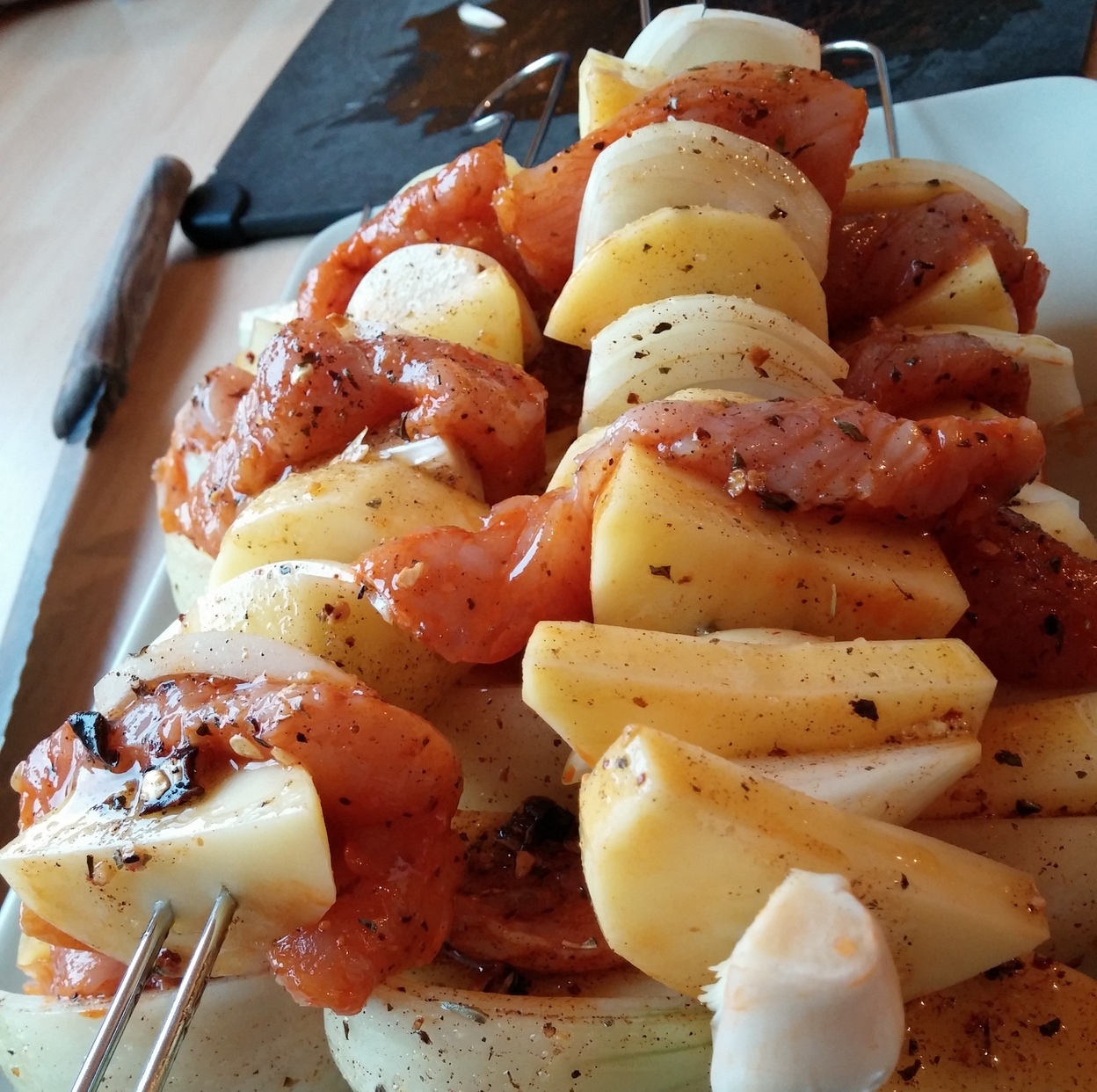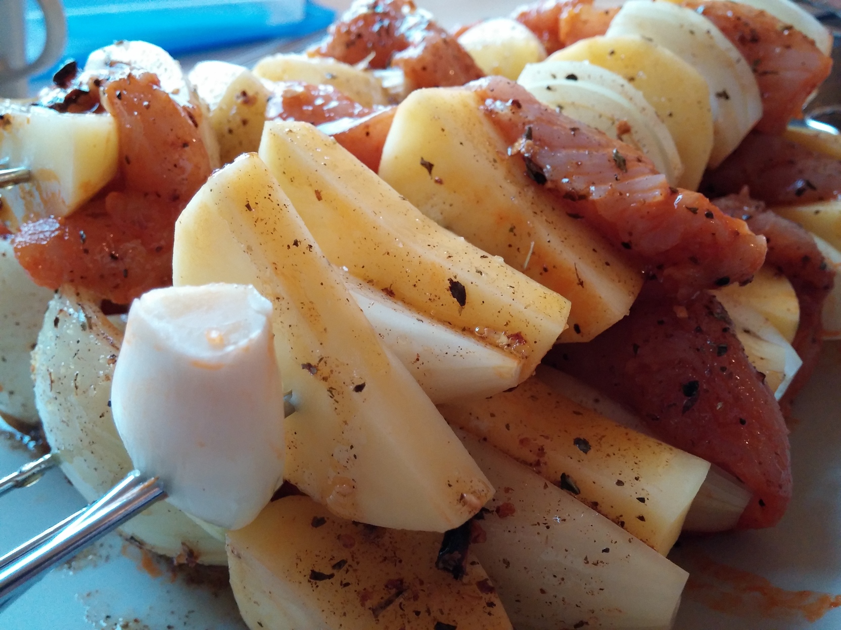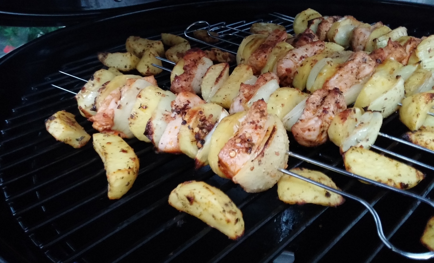 Da auch das Tortilla Grillen unsere Kartoffelvorräte nicht komplett vernichten konnte, stand somit die Kartoffel als eine Zutat fest. Mit einem bißchen Zwiebel und etwas mariniertem Hähnchenfleisch (ja, ich gebe es zu: es war fertig mariniert) sowie etwas Marinade konnte das Grillen losgehen! Fix alles kleinschneiden, aufspießen und mit etwas Olivenöl und Gewürzen (griechische Gewürzmischung und etwas Tomaten-Knoblauch-Gewürz) marinieren. Die Kartoffel-Hähnchen-Spieße circa 30 Minuten grillen und fertig ist das Menü. Kann ich nur empfehlen, es hat sehr gut geschmeckt!