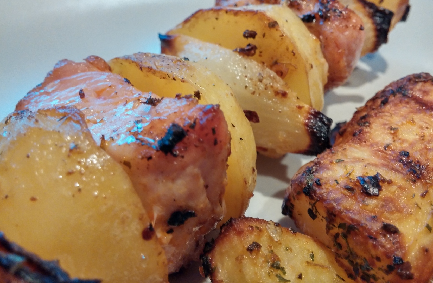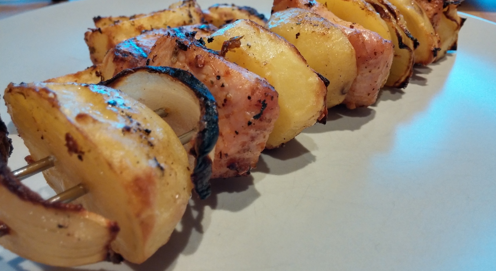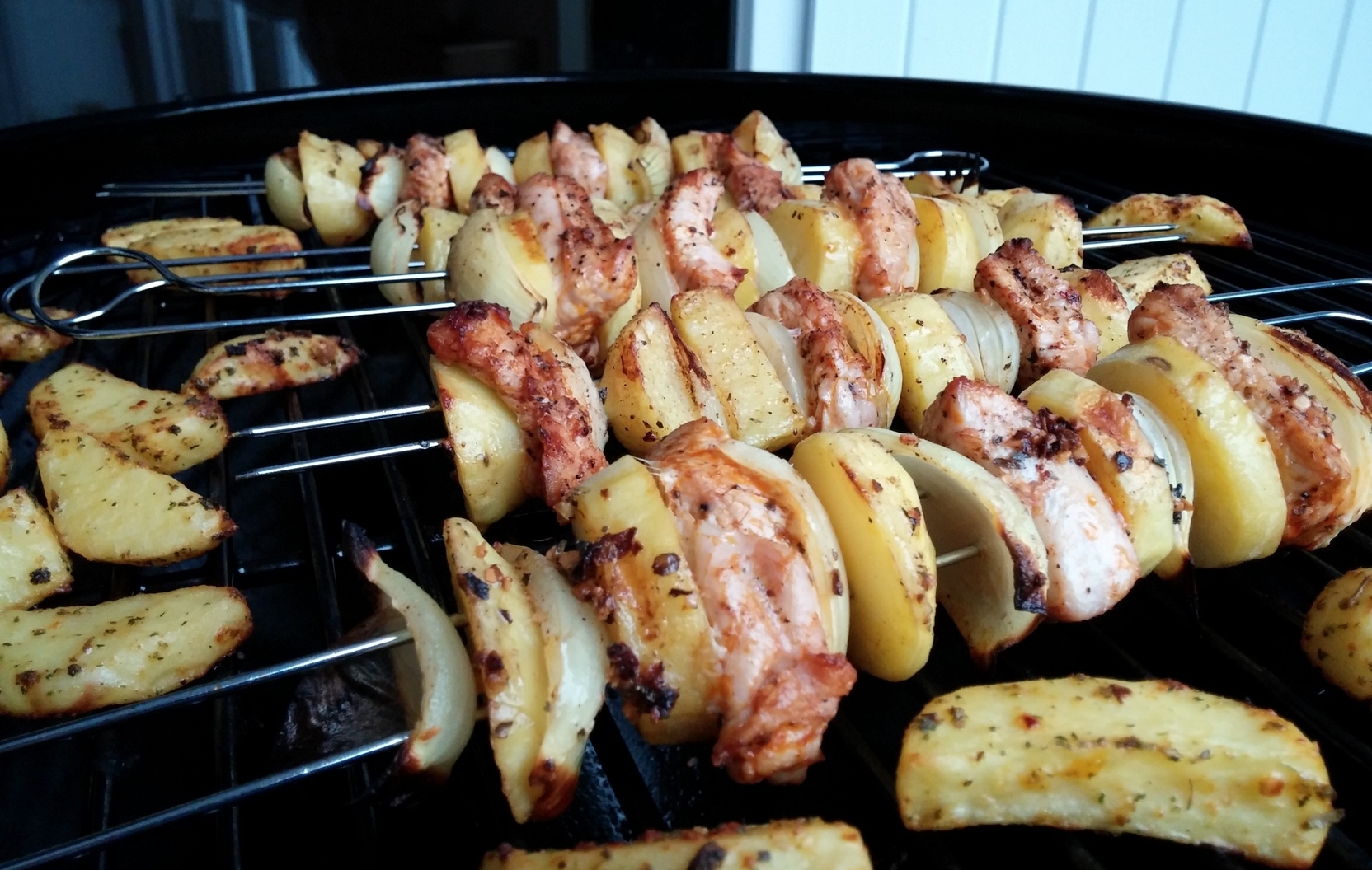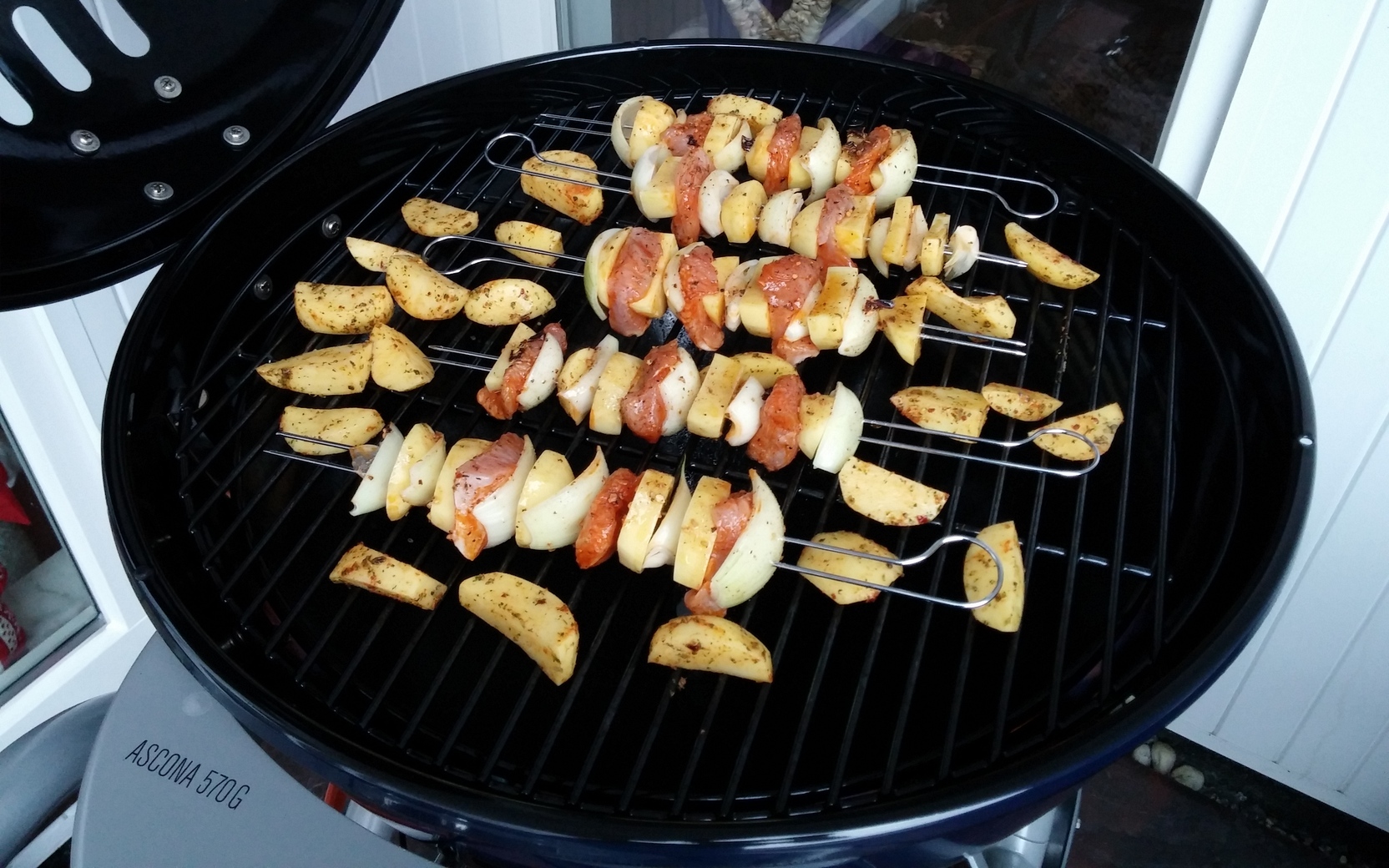 Da auch das Tortilla Grillen unsere Kartoffelvorräte nicht komplett vernichten konnte, stand somit die Kartoffel als eine Zutat fest. Mit einem bißchen Zwiebel und etwas mariniertem Hähnchenfleisch (ja, ich gebe es zu: es war fertig mariniert) sowie etwas Marinade konnte das Grillen losgehen! Fix alles kleinschneiden, aufspießen und mit etwas Olivenöl und Gewürzen (griechische Gewürzmischung und etwas Tomaten-Knoblauch-Gewürz) marinieren. Die Kartoffel-Hähnchen-Spieße circa 30 Minuten grillen und fertig ist das Menü. Kann ich nur empfehlen, es hat sehr gut geschmeckt!