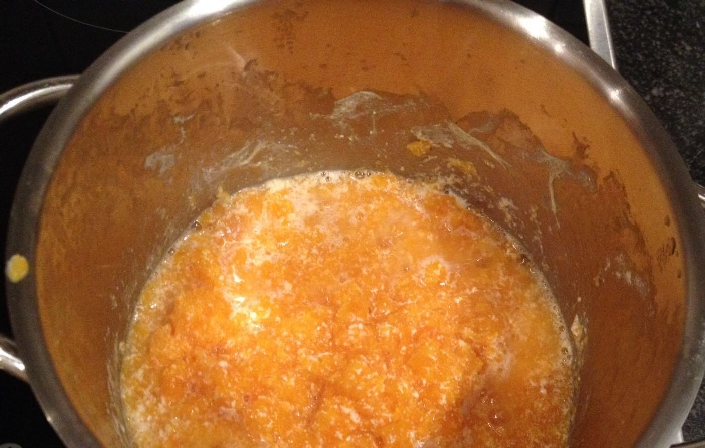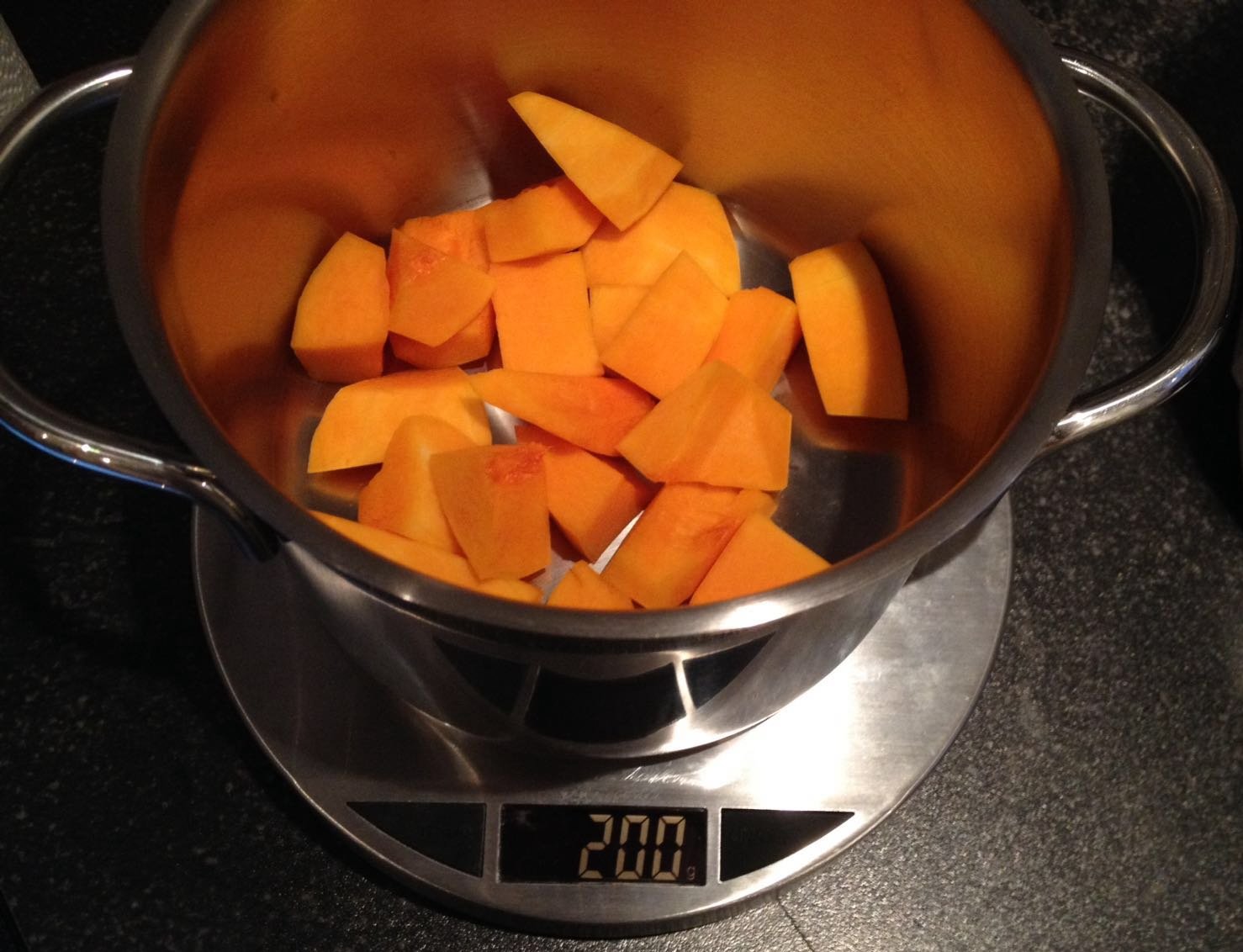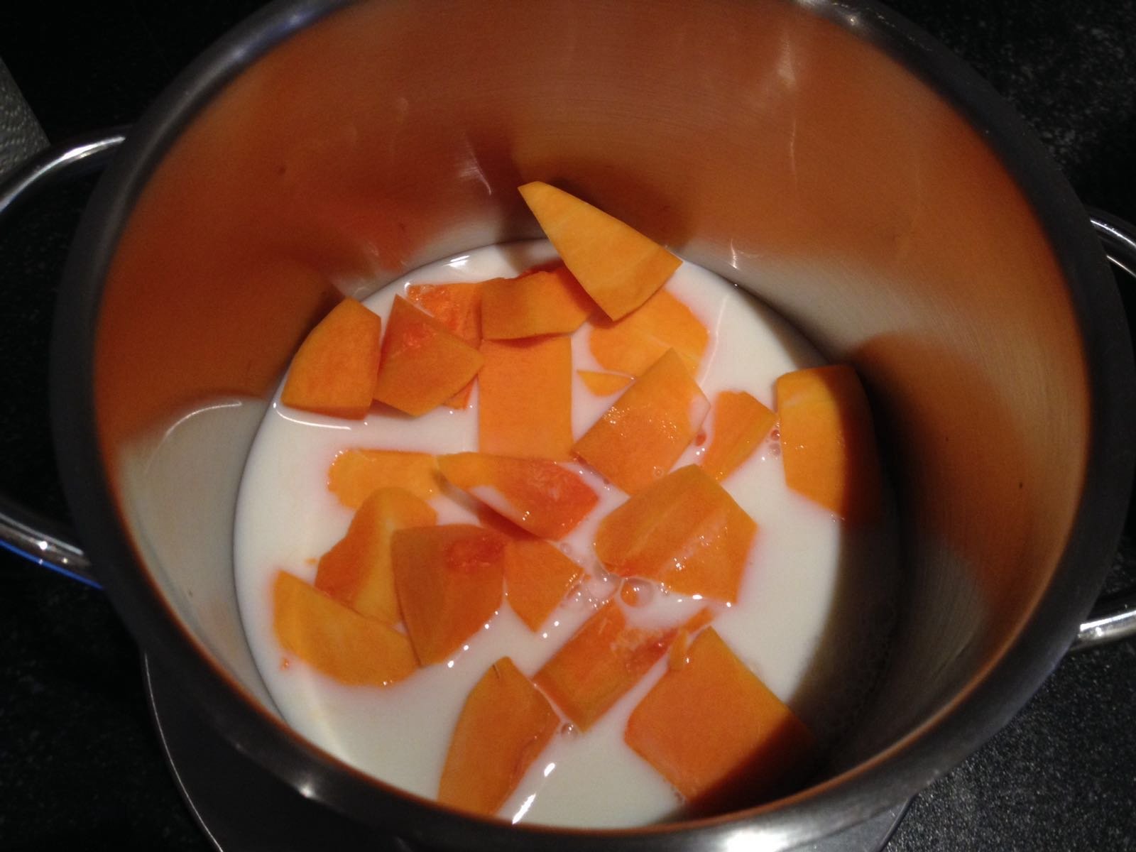 Zunächst würfele ich den Butternut-Kürbis und gebe 200 g Kürbis in einen hohen Topf; Milch dazu und erhitzen, bis der Kürbis weich wird und sich mit dem Kartoffelstampfer zerdrücken und mit der Milch vermengen lässt.