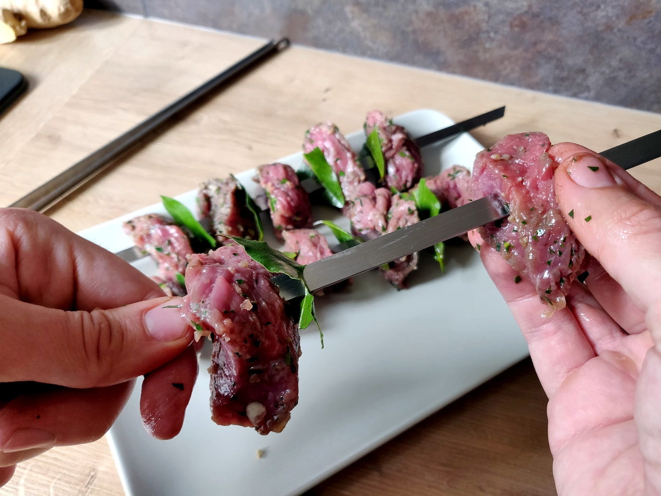 Nach 24 Stunden ist es soweit, der große Tag des Espetadas ist gekommen! Endlich kommt mein Kebab-Spieße-Set zum Einsatz und ich nutze die langen und breiteren Spieße für die Espetadas. Jeweils fünf Stücke Fleisch spieße ich auf einen Kebab-Spieß und für eine schönere Optik kommt zwischen jedes Stück Fleisch ein halbes Lorbeerblatt.