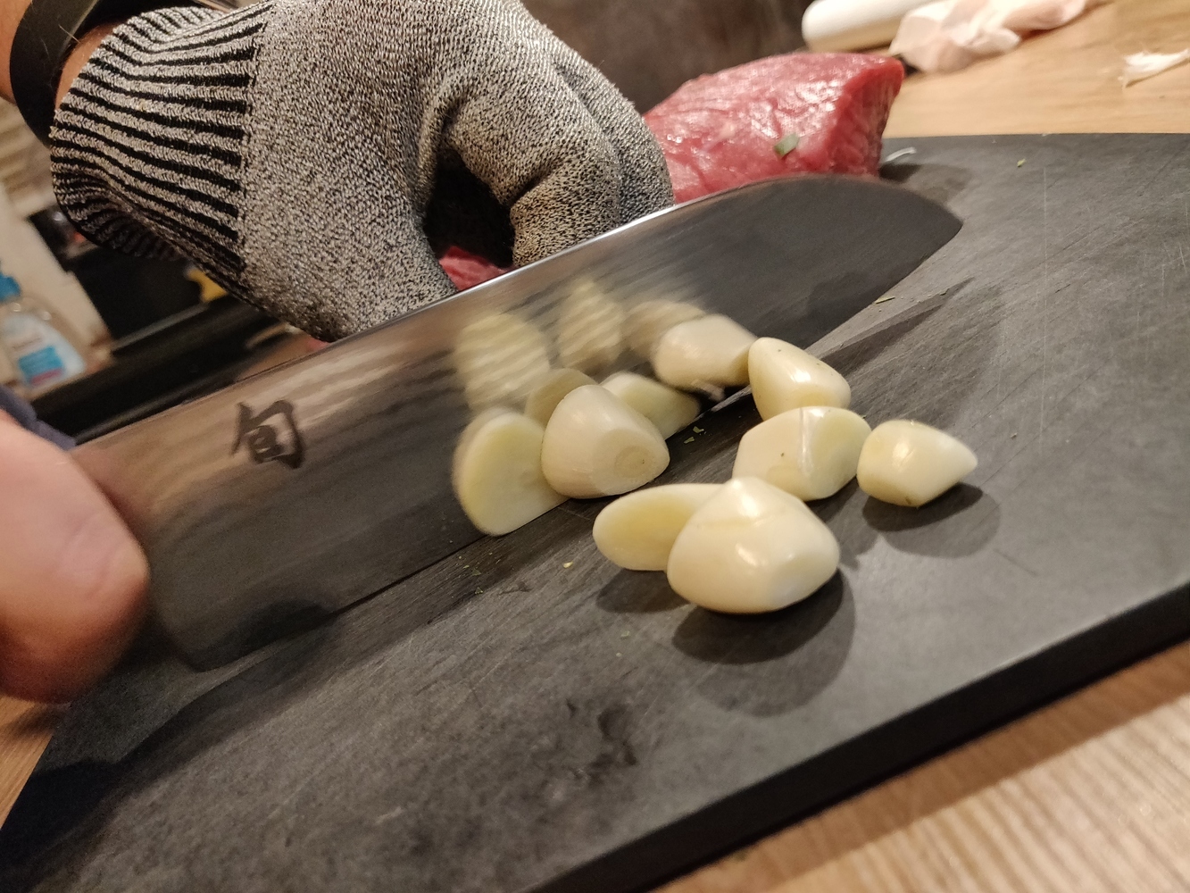 Damit das Fleisch ordentlich durchziehen und Aroma aufnehmen kann, beginne ich am Vorabend mit der Vorbereitung. Dazu putze ich den frischen Lorbeer und hacke 12 Blätter klein. Für die Marinade der Espetadas benötige ich auch Knoblauch. Viel Knoblauch. Sechs Zehen sollten es schon sein! Den Knoblauch presse ich in eine verschließbare Schüssel und gebe den gehackten Lorbeer dazu.