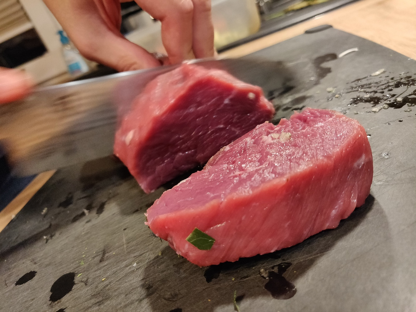 Ich bin sooo gespannt, wie die madeirischen Rindfleischspieße wohl schmecken! Der Geruch passt auf jeden Fall einhundertprozentig, es riecht nach frischem Lorbeer, Rindfleisch und Knoblauch. Die Fleischstücke lassen sich ganz leicht vom Grillspieß schieben. Beim Anschnitt zeigt sich, dass das Fleisch sehr schön zart und überhaupt nicht zäh ist. Leider habe ich durch das Parken der Espetadas auf dem Warmhalterost den Garpunkt ganz leicht überschritten, denn das Fleisch ist nur noch ganz, ganz leicht rosa von innen. Dank der guten Fleischqualität ist aber dennoch saftig und zart.