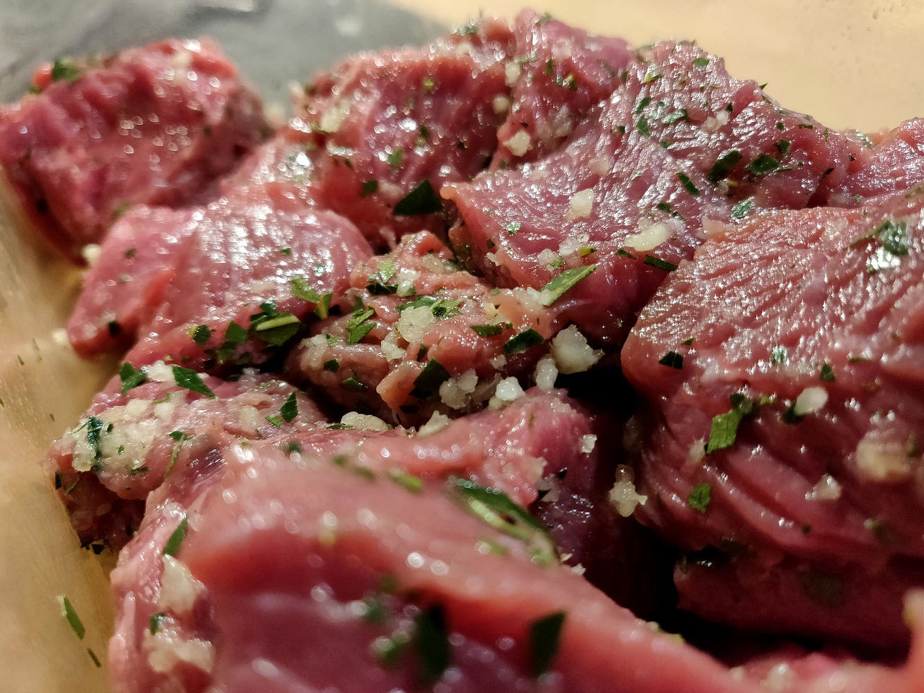Kommen wir nun zum Fleisch. Zum Grillen der Espetadas empfehle ich Rinderhüfte. Das Fleisch ist kurzfaserig und mit feinen Fettadern durchzogen und eignet sich somit sehr gut zum kurzen Angrillen. Die Rinderhüfte schneide ich in circa vier bis fünf Zentimeter große Würfel (lieber etwas größer als zu klein schneiden). Die Fleischwürfel gebe ich nun in die verschließbare Schüssel und mariniere alles mit einem kleinen Schuss Olivenöl. Ich verwende gerade so viel Olivenöl, dass die Marinade und die Gewürze gut am Fleisch haften bleiben.