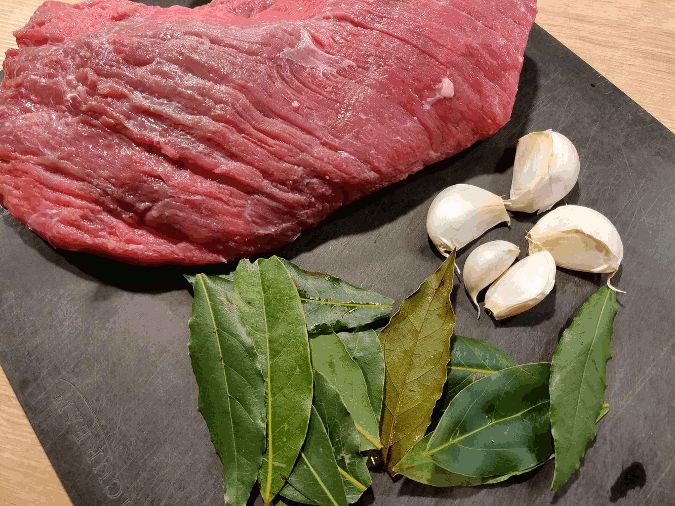 1 kg Rinderhüfte 15 - 20 frische Lorbeerblätter 6 Knoblauchzehen Olivenöl grobes Meersalz