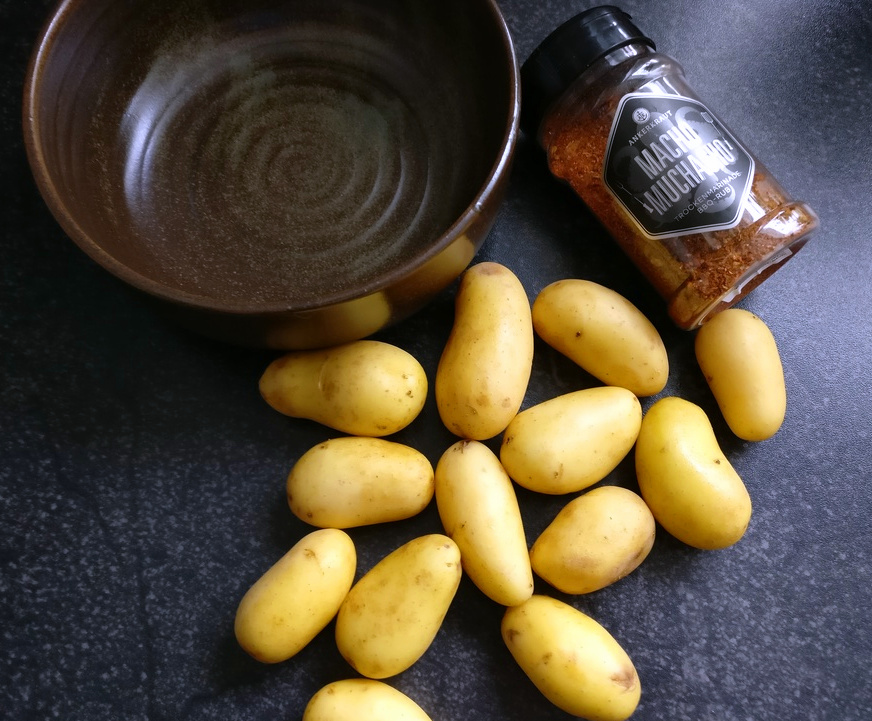 Dieser Arbeitsschritt ist schnell erledigt, denn das Fleisch ist bereits gewürzt. Also nur fix die Kartoffeln säubern und halbieren und in Olivenöl und Ankerkraut Macho Muchacho Rub marinieren. Dieser TexMex-Rub ist mittelscharf und besteht aus Kreuzkümmel, Ancho Chilis, Rosmarin, Oregano und Jalapeno. Er passt damit sehr gut zu Kartoffeln.