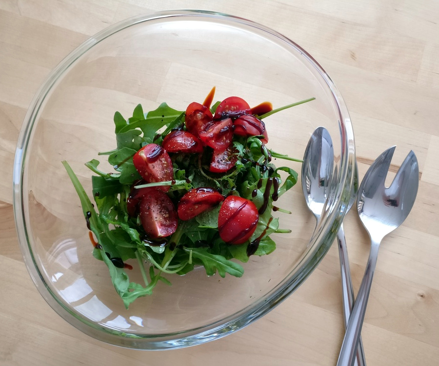 Außerdem gibt es eine Salatbeilage aus Rucola und Kirschtomaten. Das Salatdressing besteht aus Olivenöl, Balsamico Blanco und Pfeffer und Salz.
