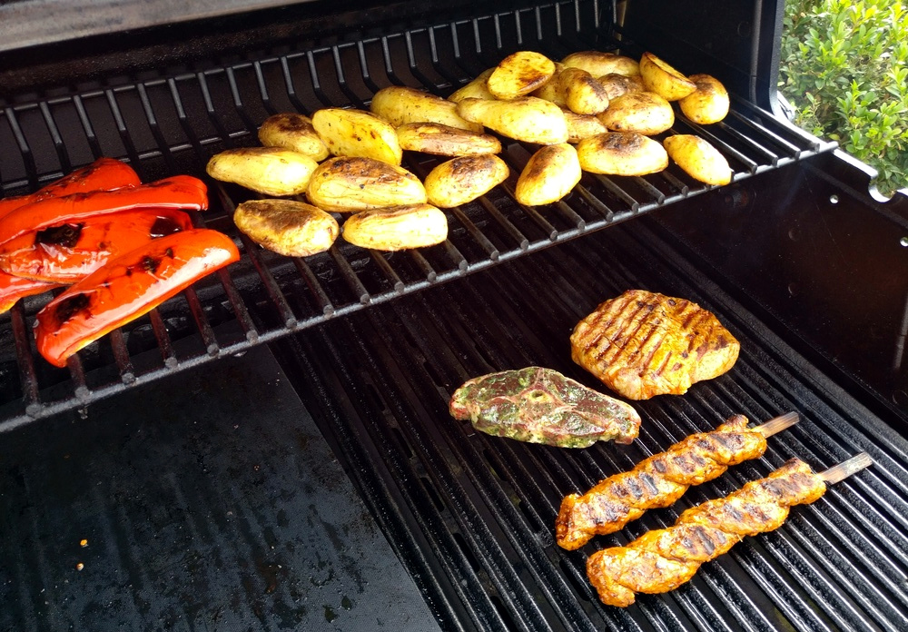 Zum Grillen meines Grillteller mit Kartoffelspalten und Paprika reichen mir zwei Brenner, also die halbe Grillfläche. Nach kurzer Vorheizzeit kommt dann meine BBQ-Grillmatte zum Einsatz, auf der ich zunächst für 15 Minuten die Kartoffelspalten bei 1/4 Leistung angrille. Durch die geringere Temperatur verbrennt der Paprika der Macho Muchacho Marinade nicht, und die Kartoffeln garen langsam durch.