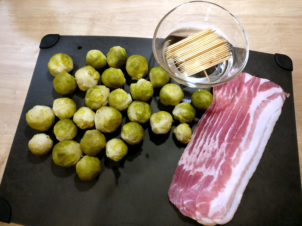 - Rosenkohl in halbe Speckscheibe einwickeln und mit Zahnstocher fixieren