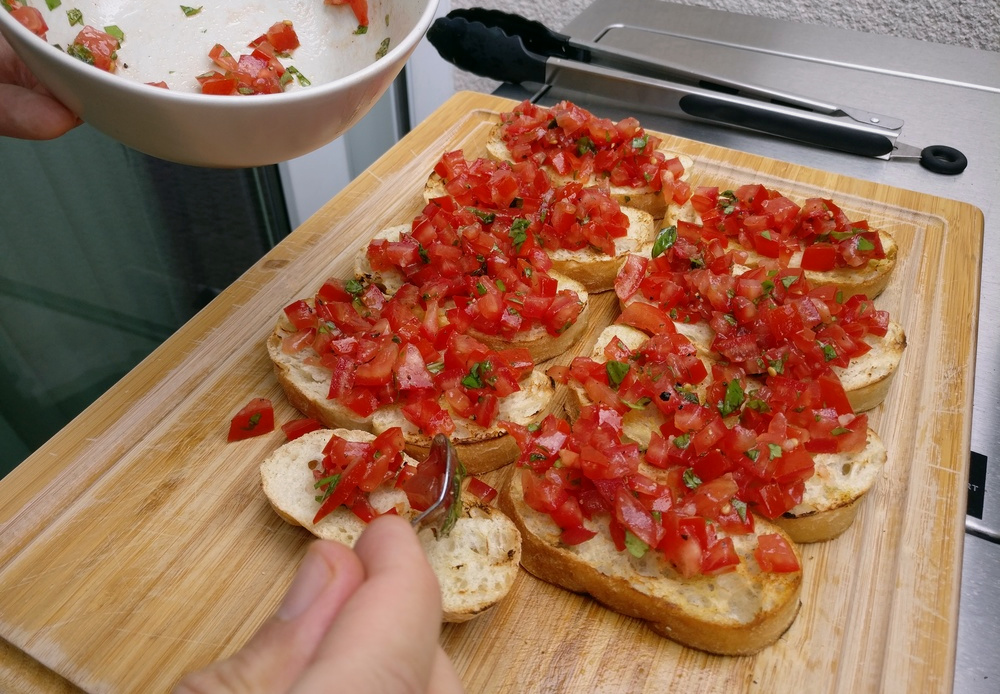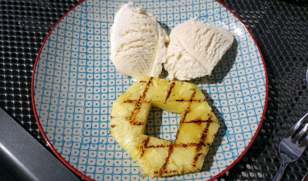 Ich habe die Tandoori Chicken Spieße mit Rosmarin-Fächerkartoffeln als 3-Gänge Grillmenü serviert. Als Vorspeise gab es die leckeren Bruschetta, als Hauptgericht dann die Hähnchenspieße mit Kartöffelchen und als süßes Dessert die gegrillte Ananas mit Vanilleeis. Eine leckere Kombination, die ich sehr empfehlen kann.