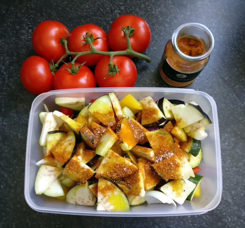 Während das Fleisch mariniert, putze und schneide ich das Gemüse in grobe Stückchen. Zum Einsatz für meine Tandoori Chicken Spieße kommen Zucchini, Aubergine, Paprika und Zwiebeln.