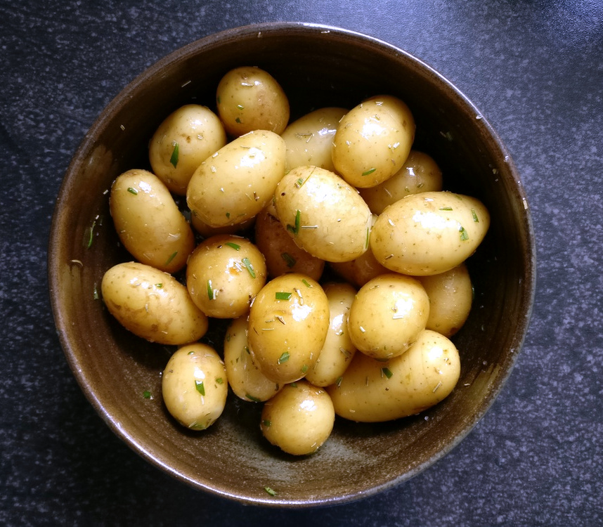 Fehlen noch die Rosmarinkartoffeln, die ich heute als Fächerkartoffeln zubereite. Die Drillinge putze und trockne ich dazu, und ritze sie im Abstand von 2 Millimeter bis 2/3 Tiefe ein. Die Kartoffeln mariniere ich dann mit Olivenöl, Salz und frischem gehackten Rosmarin.